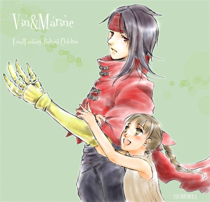 1boy 1girl black_hair black_pants braid brown_eyes brown_hair cape dress final_fantasy final_fantasy_vii final_fantasy_vii:_advent_children green_background grey_dress headband holo-holo marlene_wallace metal_gloves pants pink_ribbon red_cape red_eyes red_headband ribbon sleeveless sleeveless_dress smile square_enix turtleneck turtleneck_dress upper_body vincent_valentine