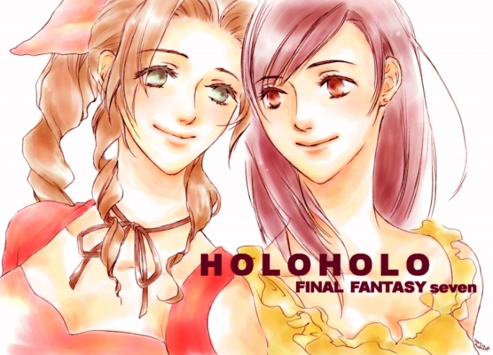 2girls aerith_gainsborough braid brown_hair choker dress earrings final_fantasy final_fantasy_vii green_eyes hair_ribbon holo-holo jacket jewelry long_hair multiple_girls necklace parted_bangs pink_dress pink_ribbon red_eyes red_jacket ribbon sidelocks smile square_enix straight_hair tifa_lockhart upper_body wavy_hair white_background yellow_dress