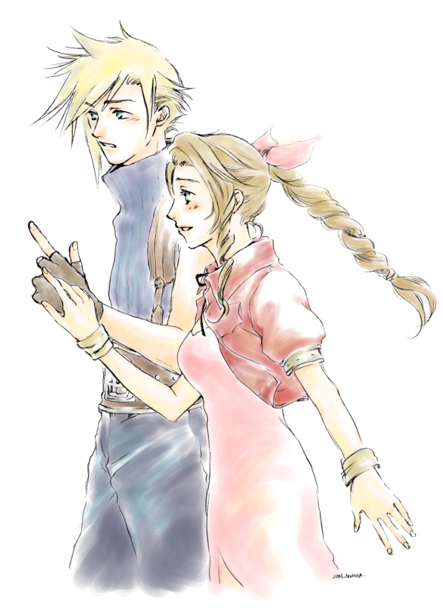 1boy 1girl aerith_gainsborough belt blonde_hair blue_eyes blue_pants blue_shirt blush bracelet braid brown_hair cloud_strife cropped_jacket final_fantasy final_fantasy_vii fingerless_gloves gloves green_eyes hair_ribbon holo-holo jacket jewelry long_hair necklace pants parted_bangs pink_ribbon pointing puffy_short_sleeves puffy_sleeves red_jacket ribbon shirt short_hair short_sleeves sidelocks sleeveless sleeveless_turtleneck smile spiked_hair square_enix suspenders turtleneck upper_body wavy_hair white_background