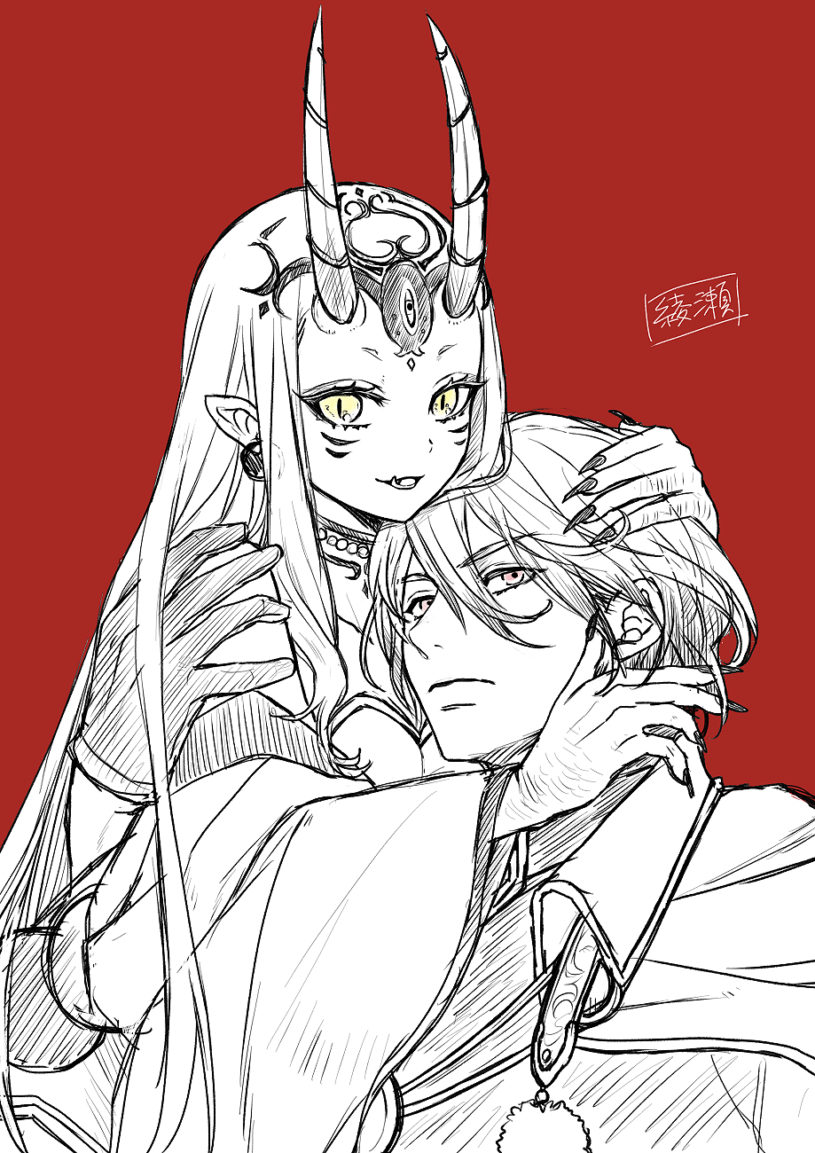 1boy 1girl earrings facial_mark fang fate/grand_order fate_(series) fingernails forehead_mark gloves hair_between_eyes highres hizuki_aya horns hug ibaraki_douji_(fate) japanese_clothes jewelry kimono long_hair looking_at_viewer oni oni_horns parted_lips pink_eyes pom_pom_(clothes) red_background sharp_fingernails simple_background sketch smile spot_color upper_body watanabe_no_tsuna_(fate) watanabe_no_tsuna_(third_ascension)_(fate) wide_sleeves yellow_eyes