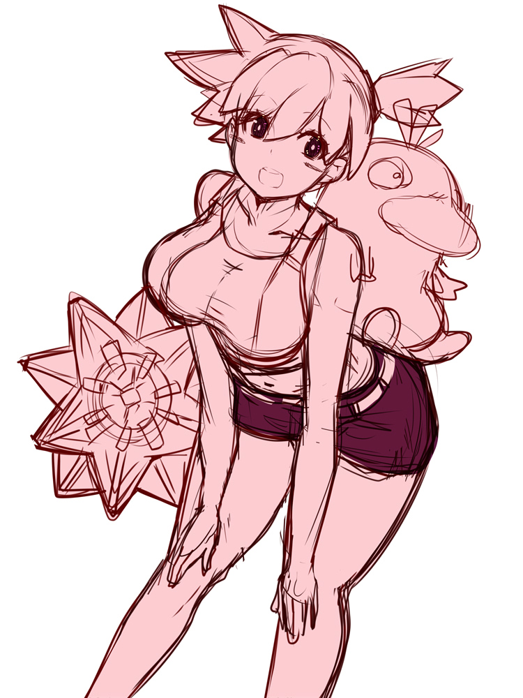 1girl asymmetrical_hair bare_shoulders blush breasts denim denim_shorts doodle eight_doodle gen_1_pokemon gym_leader hair_tie large_breasts legs looking_at_viewer misty_(pokemon) monochrome navel nintendo open_mouth orange_hair pokemon pokemon:_let's_go_pikachu!_and_let's_go_eevee! ponytail psyduck shirt short_hair short_shorts shorts side_ponytail smile starmie white_shirt