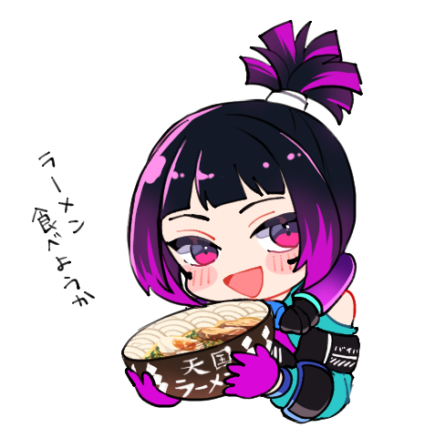 1girl :d animification apex_legends aqua_jacket black_hair blunt_bangs blush blush_stickers bowl chibi fluorescent_tech_valkyrie food gloves holding holding_bowl jacket looking_to_the_side lowres multicolored_hair no_nose noodles official_alternate_costume open_mouth pink_eyes ponytail portrait purple_gloves purple_hair ramen riku_(ururi7610) short_hair simple_background smile solo streaked_hair translation_request tsurime valkyrie_(apex_legends) white_background
