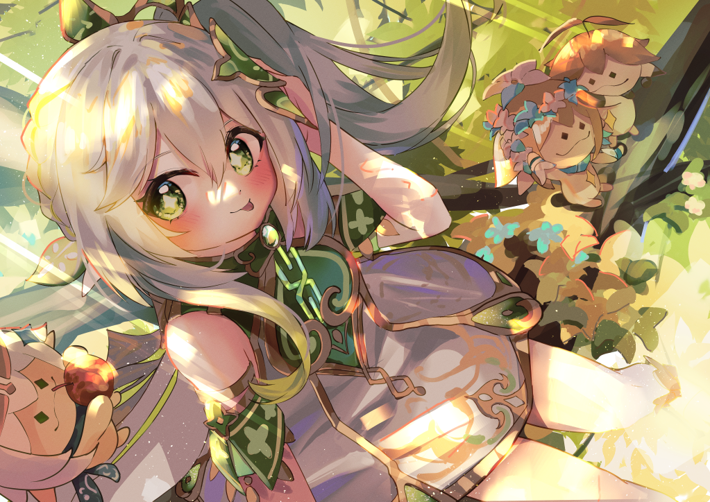 1girl :p adjusting_hair aether_(genshin_impact) aranara_(genshin_impact) blurry cape commentary_request depth_of_field detached_sleeves dress from_above genshin_impact gradient_hair green_eyes hair_between_eyes hair_ornament long_hair looking_at_viewer looking_up lumine_(genshin_impact) minertime multicolored_hair nahida_(genshin_impact) paimon_(genshin_impact) pointy_ears short_sleeves side_ponytail sidelocks sitting_on_branch sunlight symbol-shaped_pupils tongue tongue_out white_dress white_hair