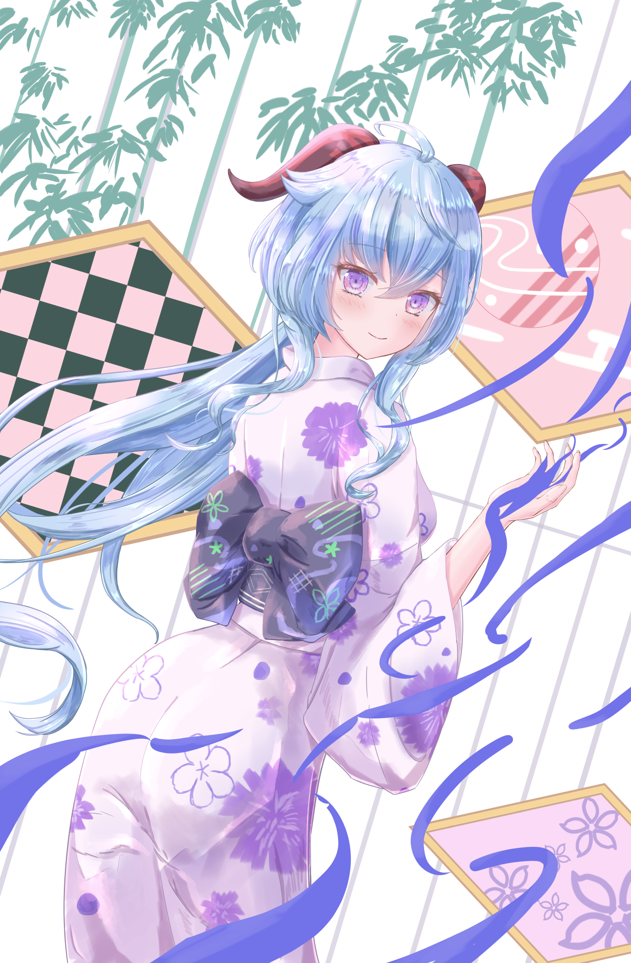 1girl ahoge akaneuta_chitose alternate_costume ass blue_hair commentary_request from_behind ganyu_(genshin_impact) genshin_impact hair_between_eyes highres horns japanese_clothes kimono leaning_forward long_hair long_sleeves looking_at_viewer looking_back low_ponytail obi ponytail purple_eyes sash sidelocks smile solo wide_sleeves yukata