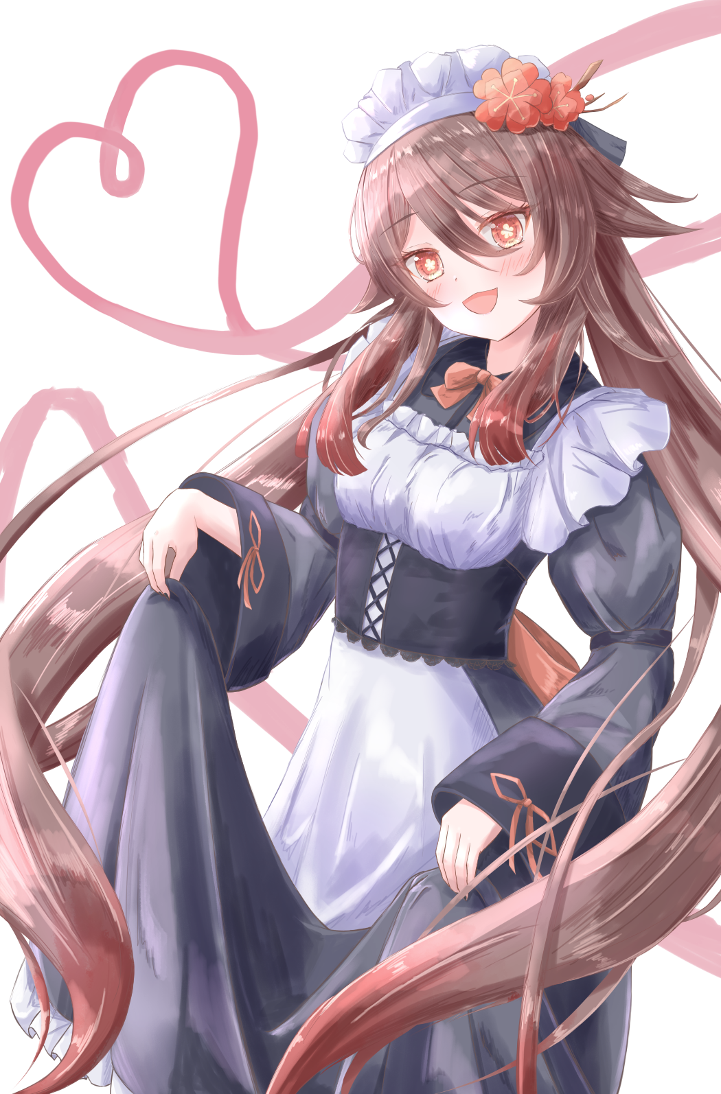 1girl :d akaneuta_chitose alternate_costume apron brown_hair clothes_lift commentary_request dress dress_lift enmaided flower genshin_impact hair_between_eyes hair_flower hair_ornament head_tilt highres holding_own_dress hu_tao_(genshin_impact) lifting_own_clothes long_hair long_sleeves looking_at_viewer maid maid_apron maid_headdress open_mouth orange_eyes sidelocks simple_background smile solo symbol-shaped_pupils twintails white_background
