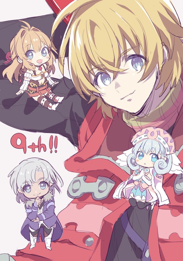 2boys 2girls :d :o alvis_(xenoblade) black_thighhighs blonde_hair blue_eyes boots brown_shirt cape chibi coat dress elbow_gloves fiora_(xenoblade) full_body gloves hand_on_own_chin himeno345 holding holding_sword holding_weapon jacket long_hair long_sleeves looking_at_viewer melia_antiqua multiple_boys multiple_girls navel open_mouth purple_coat red_jacket shirt short_hair shulk_(xenoblade) simple_background smile sword thigh_boots thighhighs weapon weapon_on_back white_background white_cape white_dress white_gloves white_sleeves xenoblade_chronicles_(series) xenoblade_chronicles_1