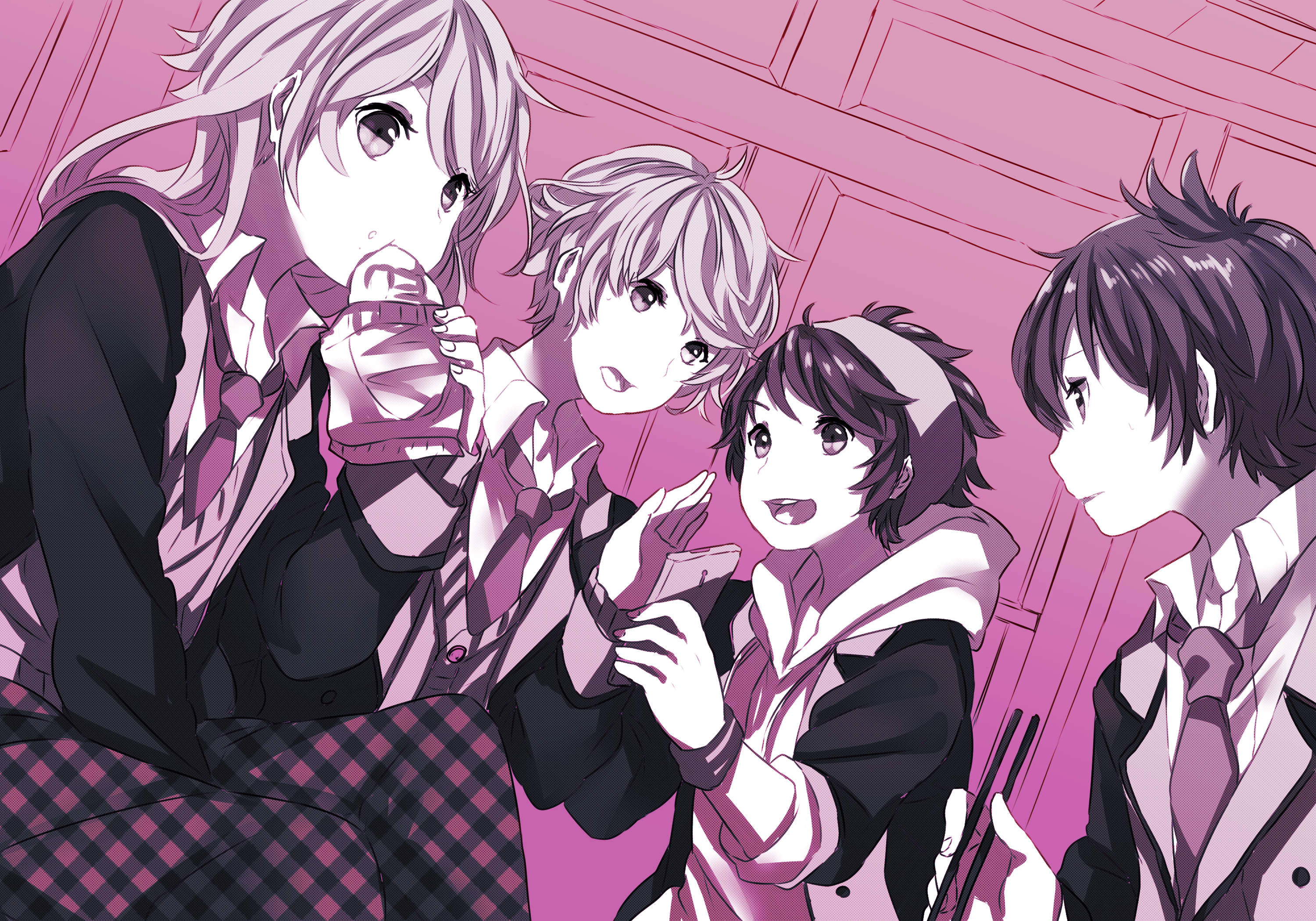 1girl 3boys chinese_zodiac chopsticks eating gingham_clothes headband highres hood hood_down hoodie houzuki_ringo indoors long_hair multiple_boys necktie original personification pink_theme short_hair sitting sweater_vest unmoving_pattern wristband