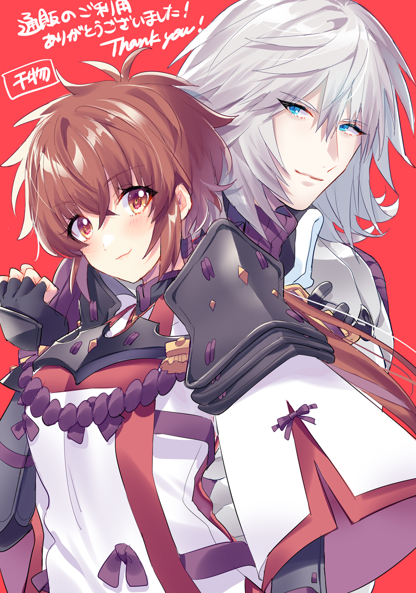 1boy 1girl arm_guards armor black_gloves blue_eyes brown_eyes brown_hair closed_mouth coat fingerless_gloves gloves himeno345 jin_(xenoblade) long_hair looking_at_viewer lora_(xenoblade) red_background shoulder_armor simple_background smile upper_body white_coat white_hair xenoblade_chronicles_(series) xenoblade_chronicles_2 xenoblade_chronicles_2:_torna_-_the_golden_country