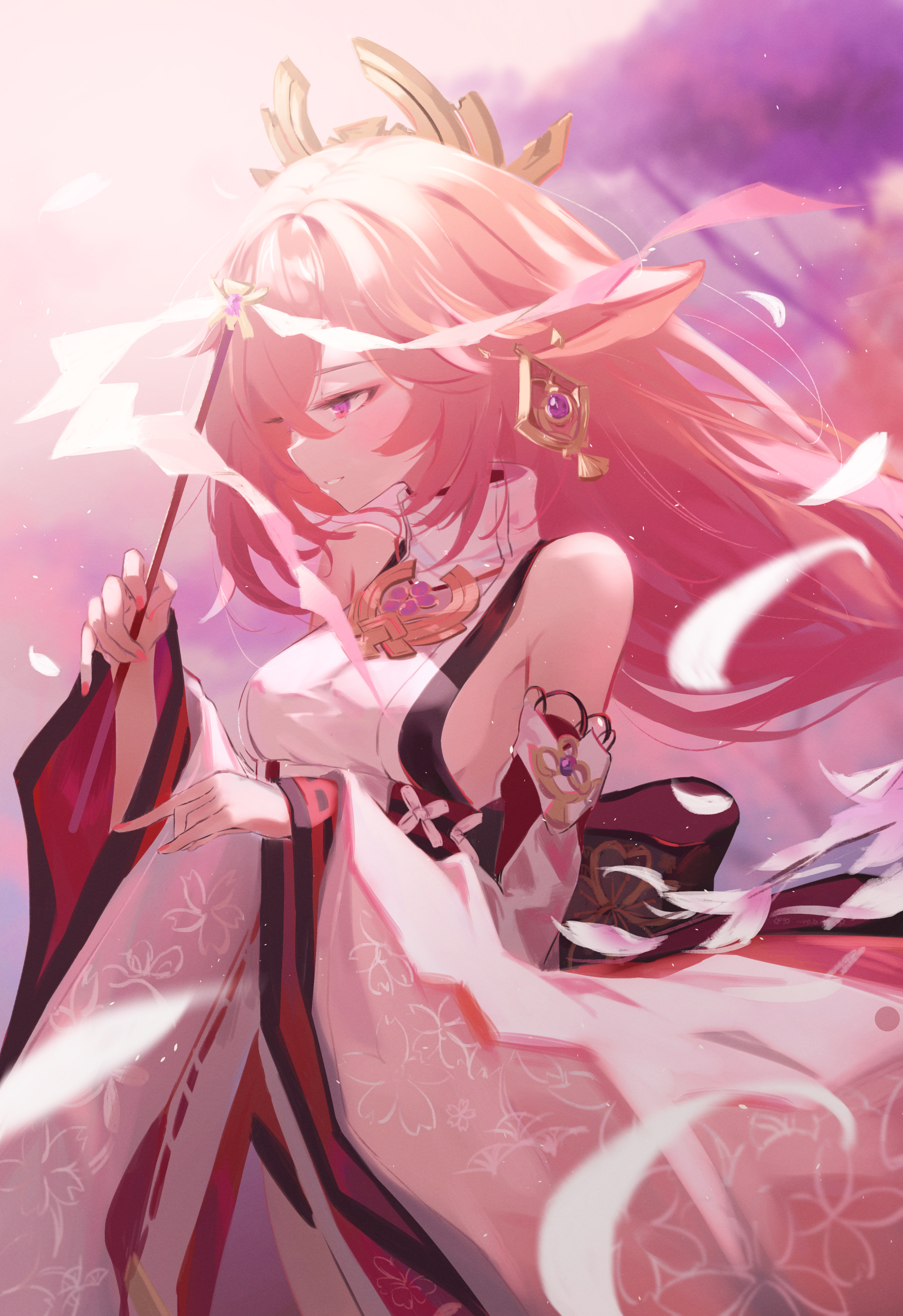 1girl absurdres animal_ears bare_shoulders breasts detached_sleeves dress earrings genshin_impact gohei highres jewelry long_hair medium_breasts pink_hair purple_eyes sideboob smile solo timo_wei95 wide_sleeves yae_miko