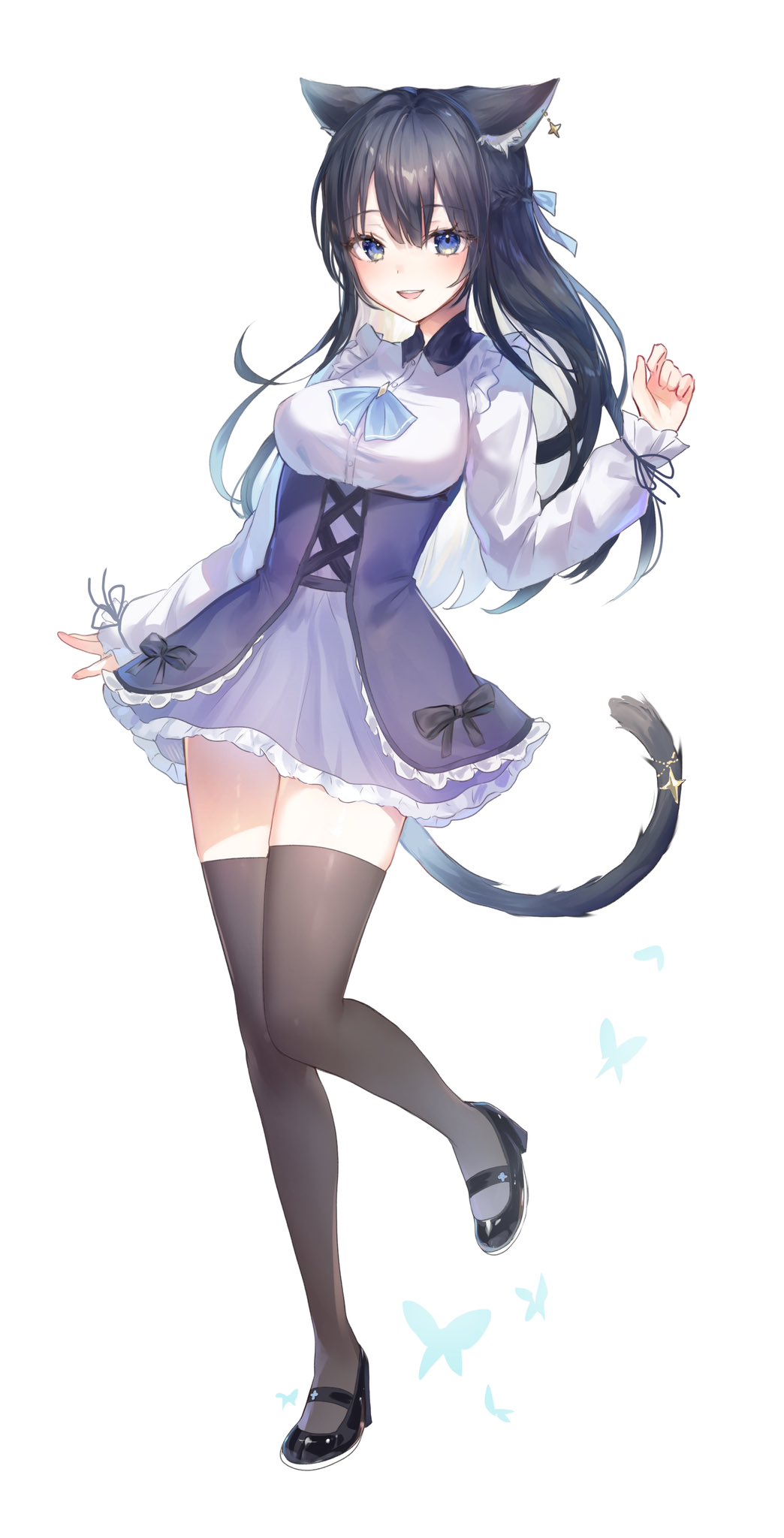 1girl animal_ears arm_at_side black_footwear black_hair black_tail blue_bow blue_butterfly blue_eyes blush bow bowtie breasts brown_thighhighs bug butterfly cat_ears cat_girl cat_tail collared_shirt dot_nose dress frilled_dress frills full_body hair_bow hair_ornament high_heels highres insect leg_up long_hair long_sleeves medium_breasts open_mouth original outstretched_arm pudding_cream purple_dress shirt sidelocks simple_background smile solo standing standing_on_one_leg tail teeth thighhighs upper_teeth_only white_background white_shirt