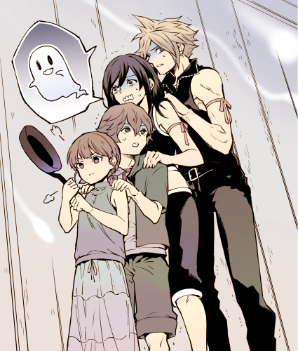 2boys 2girls arm_ribbon bare_shoulders belt belt_buckle black_hair black_pants black_shorts blonde_hair brown_eyes brown_hair buckle child cloud_strife crop_top denzel_(ff7) family final_fantasy final_fantasy_vii final_fantasy_vii:_advent_children ghost hands_on_another's_shoulders high_collar holding long_hair lowres marlene_wallace mono0805 multiple_boys multiple_girls pants ribbon scared shirt shorts frying_pan sleeveless speech_bubble spiked_hair standing tifa_lockhart undershirt