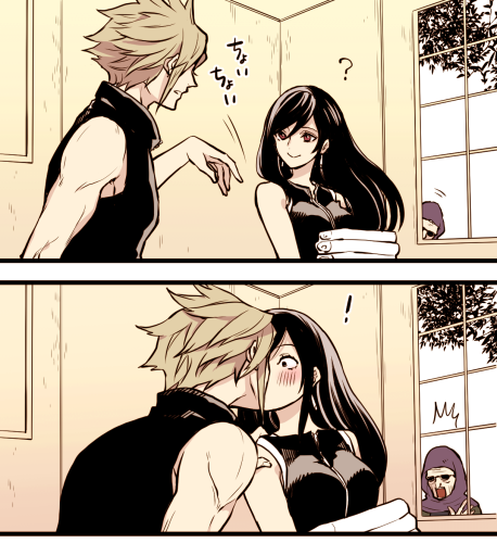 ! 1boy 2girls 2koma ? bare_arms bare_shoulders black_hair blonde_hair blush breasts cloud_strife comic commentary_request couple crop_top day earrings final_fantasy final_fantasy_vii final_fantasy_vii:_advent_children grey_hair hands_on_another's_shoulder high_collar holding indoors jewelry kiss large_breasts leaf long_hair looking_at_another looking_inside lowres marle_(ff7r) mono0805 multiple_girls old old_woman purple_headwear red_eyes sleeveless smile spiked_hair sunglasses surprise_kiss surprised tifa_lockhart undershirt upper_body window