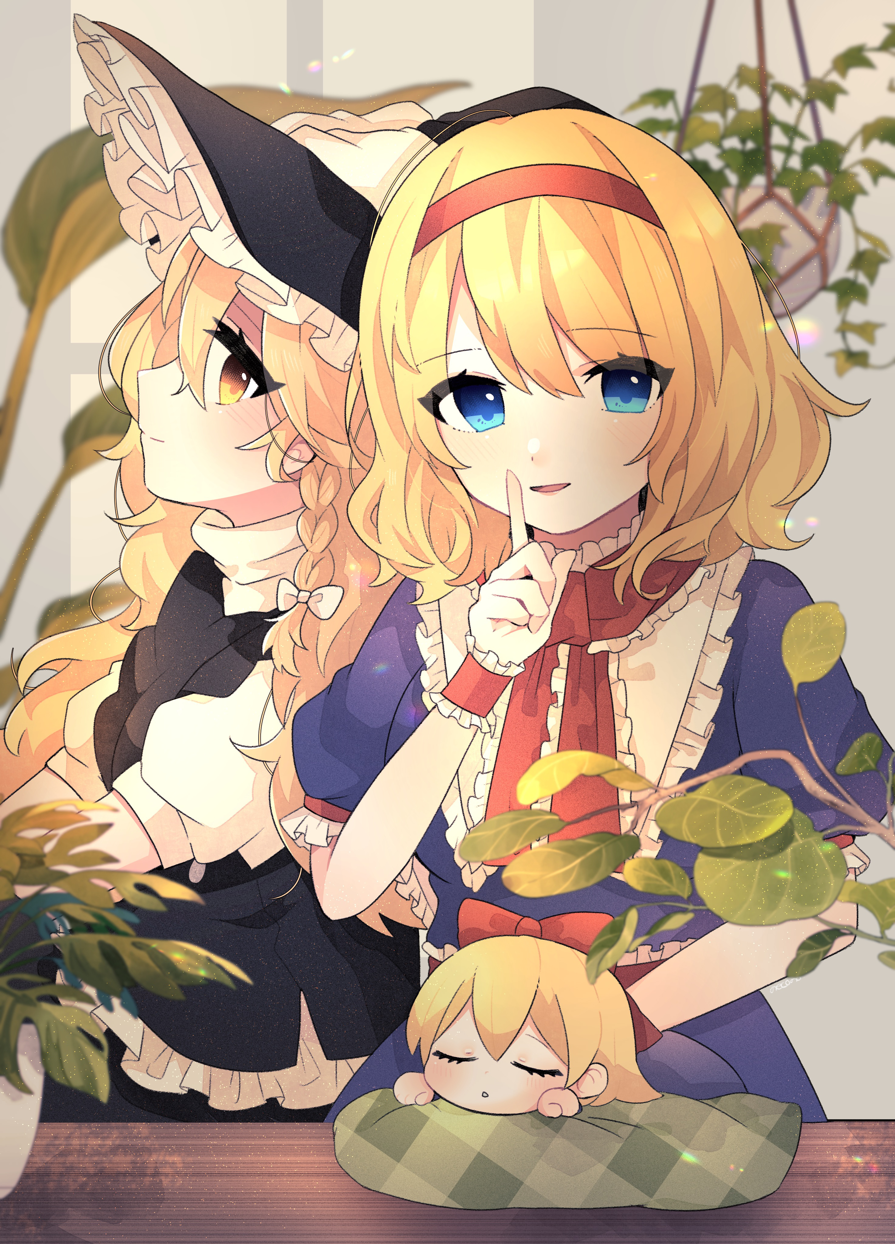 2girls absurdres alice_margatroid black_vest blonde_hair blue_dress blue_eyes blush bow braid closed_eyes closed_mouth commentary_request dress frilled_shirt_collar frills hair_bow hairband hanging_plant hat highres index_finger_raised indoors kirisame_marisa long_hair looking_at_viewer medium_hair multiple_girls necono_(nyu6poko) open_mouth plant potted_plant puffy_short_sleeves puffy_sleeves red_bow red_hairband shanghai_doll short_sleeves sleeping smile touhou turtleneck vest witch_hat wrist_cuffs yellow_eyes