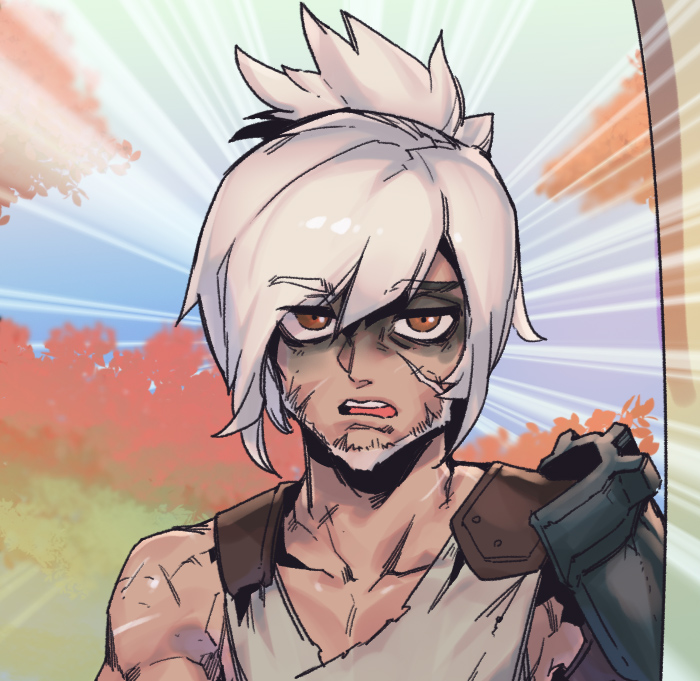 1boy beard brown_eyes collarbone facial_hair genderswap genderswap_(ftm) league_of_legends open_mouth phantom_cross portrait riven_(league_of_legends) scar shiny_skin short_hair shoulder_plates single_shoulder_pad solo teeth tree upper_teeth_only