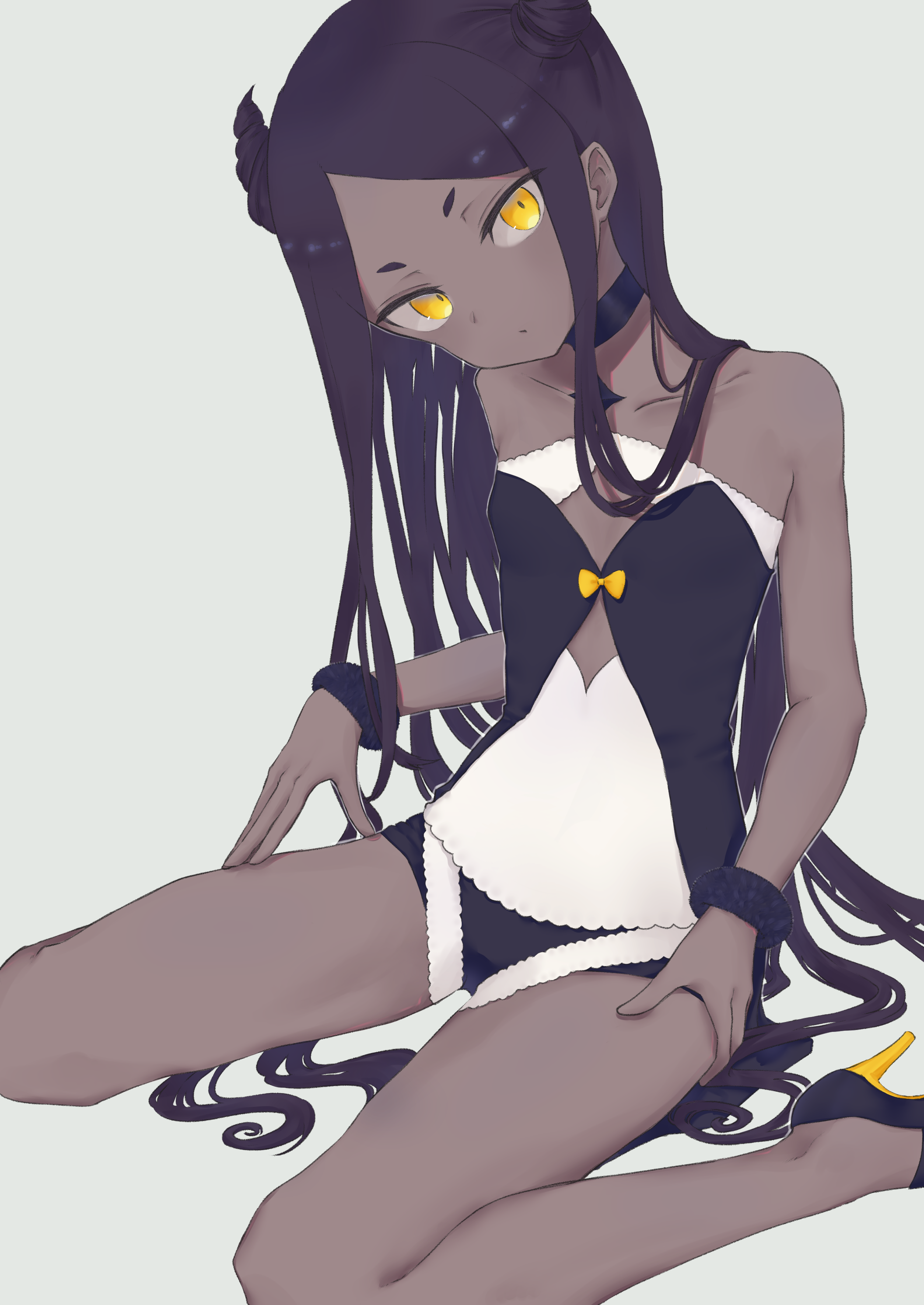 1girl absurdres bare_shoulders black_hair choker commentary_request dark-skinned_female dark_skin diamond_cutout expressionless flat_chest hair_horns head_tilt high_heels highres indie_virtual_youtuber isanatori kuroboshi_kouhaku long_hair looking_at_viewer original parted_bangs platform_footwear platform_heels roroboshi-chan short_eyebrows short_shorts shorts simple_background sitting solo very_long_hair virtual_youtuber wariza wrist_cuffs yellow_eyes