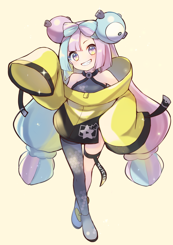 1girl arm_up bike_shorts black_shirt black_shoes black_shorts black_thighhighs blue_hair bow character_hair_ornament commentary_request full_body grin hair_bow hair_ornament iono_(pokemon) jacket long_hair long_sleeves low-tied_long_hair low_twintails multicolored_hair nintendo pink_eyes pink_hair pokemon pokemon_scarlet_and_violet ribbon sen1986 sharp_teeth shirt shoes shorts single_thighhigh sleeveless sleeveless_shirt sleeves_past_wrists smile solo teeth thigh_strap thighhighs twintails two-tone_hair very_long_hair very_long_sleeves yellow_jacket