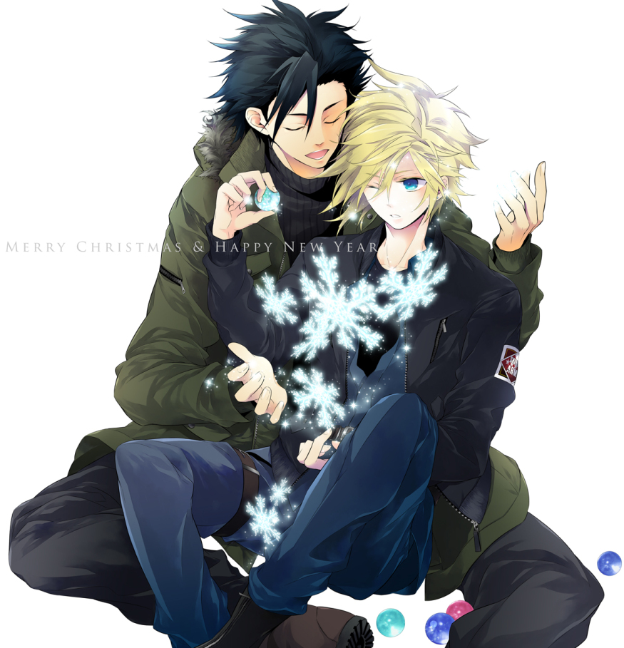 2boys akizuki_ryou_(gakuen_kumikyoku) black_hair black_jacket blonde_hair blue_eyes blue_pants boots closed_eyes cloud_strife crisis_core:_final_fantasy_vii final_fantasy final_fantasy_vii green_jacket grey_pants hair_between_eyes jacket male_focus materia multiple_boys one_eye_closed pants sitting sitting_on_lap sitting_on_person spiked_hair square_enix turtleneck white_background wink yaoi zack_fair