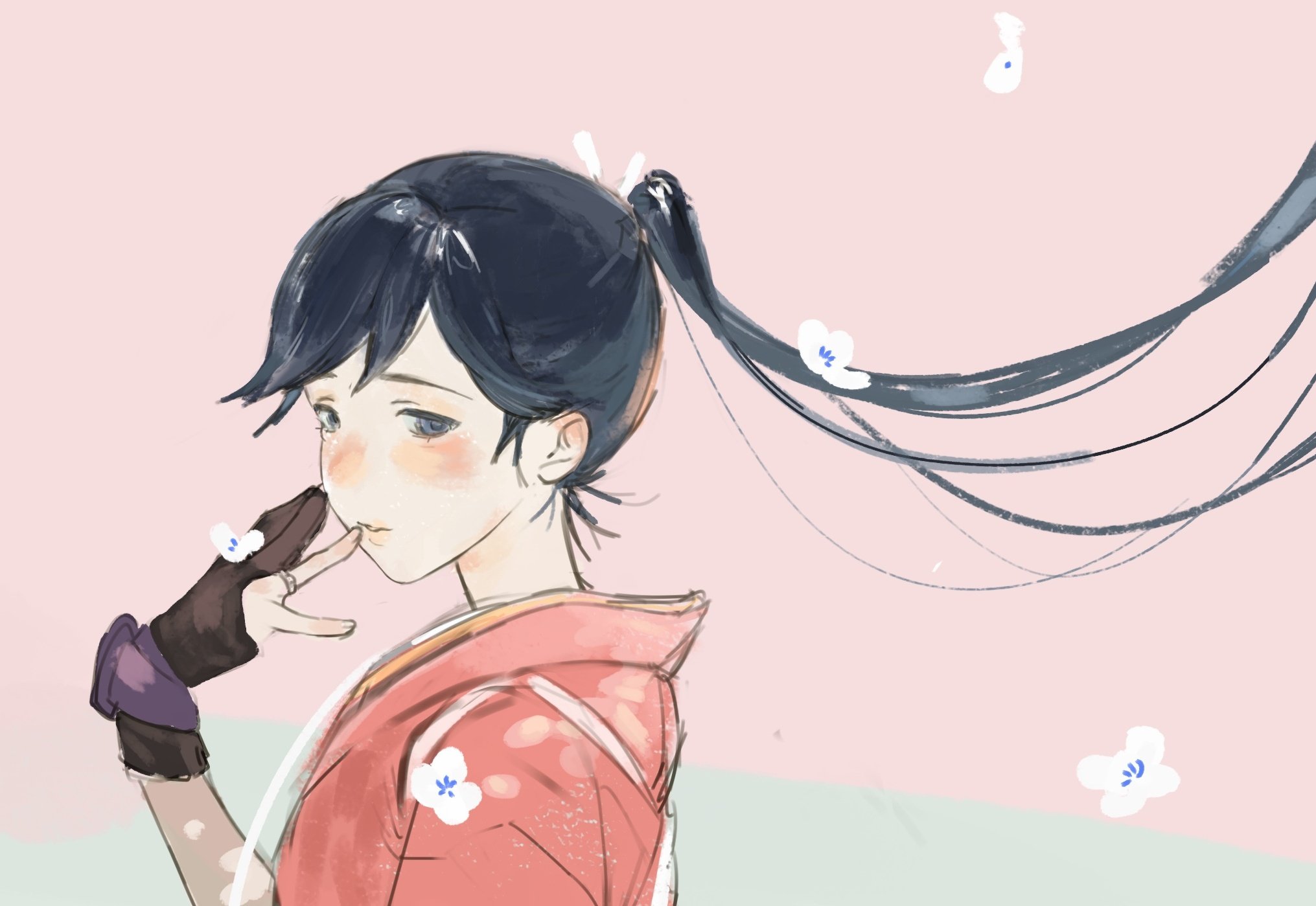 1girl black_hair brown_gloves from_side gbfwakannnaiman gloves hair_ribbon highres houshou_(kancolle) houshou_kai_ni_(kancolle) japanese_clothes kantai_collection kimono partially_fingerless_gloves partly_fingerless_gloves pink_background pink_kimono ponytail ribbon sash solo upper_body yugake