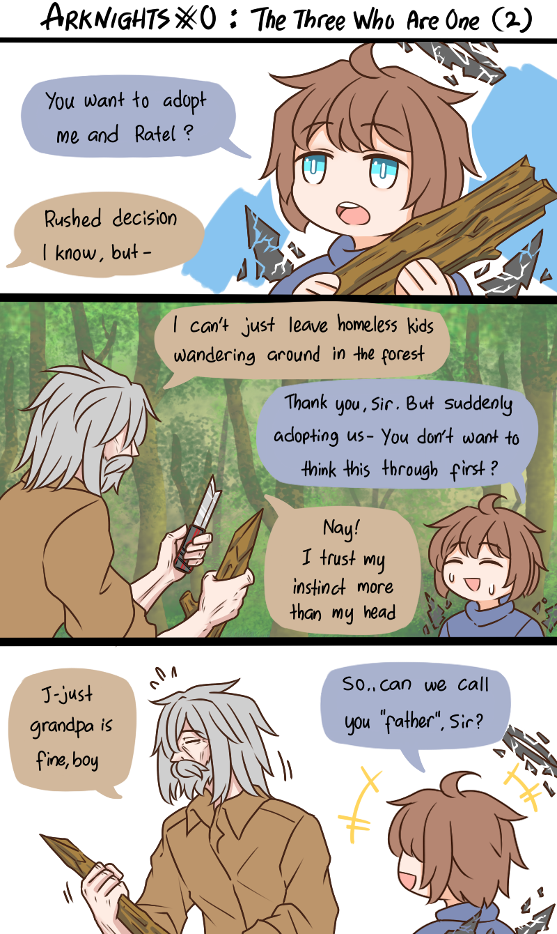 +++ 2boys =_= ahoge aqua_eyes arknights beard boxcutter brown_hair comic english_text facial_hair flying_sweatdrops grey_hair guin_guin halo highres multiple_boys mustache old_man_(guin_guin) open_mouth ratel_(guin_guin) smile wings wood