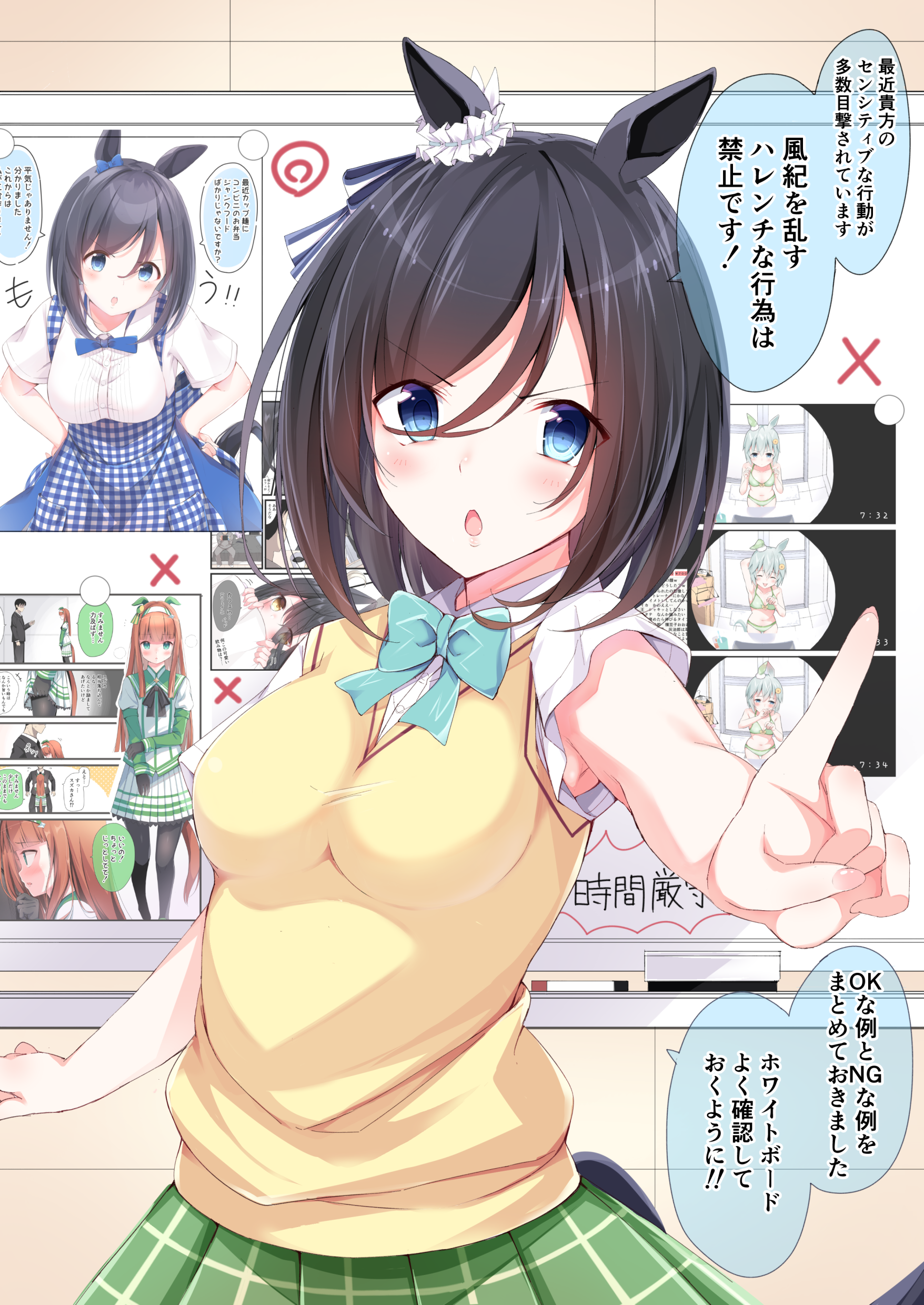 1girl absurdres animal_ears black_hair blue_eyes bob_cut character_request collared_shirt commentary_request cosplay cowboy_shot dress_shirt eishin_flash_(umamusume) green_skirt highres horse_ears horse_girl horse_tail index_finger_raised kotegawa_yui kotegawa_yui_(cosplay) plaid_clothes plaid_skirt scrunchie shirt short_hair short_sleeves silence_suzuka_(umamusume) skirt solo sweater_vest tail tktk135 to_love-ru translation_request umamusume white_scrunchie white_shirt