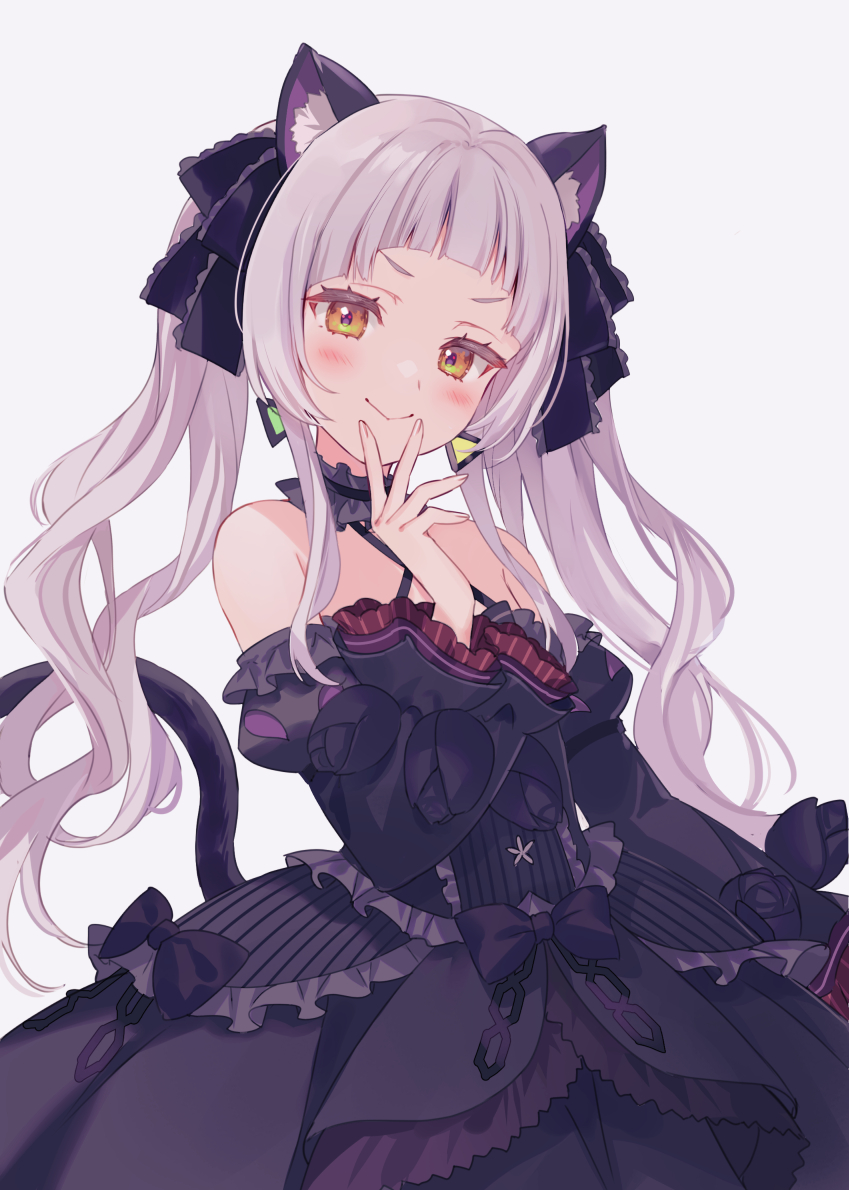 1girl animal_ears blunt_bangs cat_ears cat_tail dress frilled_dress frilled_ribbon frills fukahire_(ruinon) grey_hair hair_ribbon hand_on_own_face hololive looking_at_viewer murasaki_shion murasaki_shion_(gothic_lolita) ribbon simple_background smile solo tail twintails virtual_youtuber white_background yellow_eyes