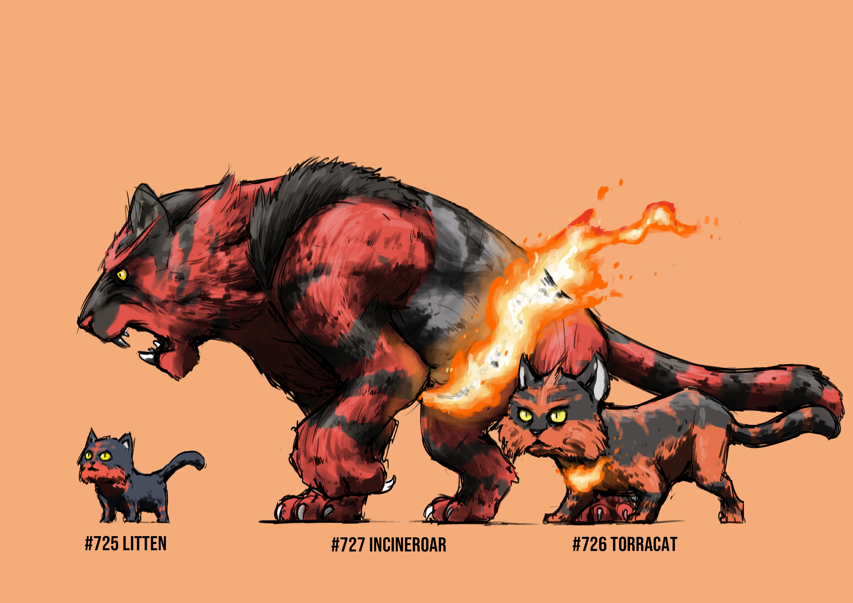 :< :3 absurdres animal_focus blacknirrow cat character_name claws closed_mouth english_text evolutionary_line fangs fire from_side full_body gen_7_pokemon highres incineroar leg_up litten nintendo no_humans open_mouth orange_background orange_theme pokedex_number pokemon pokemon_(creature) profile realistic simple_background sketch slit_pupils tiger torracat walking yellow_eyes