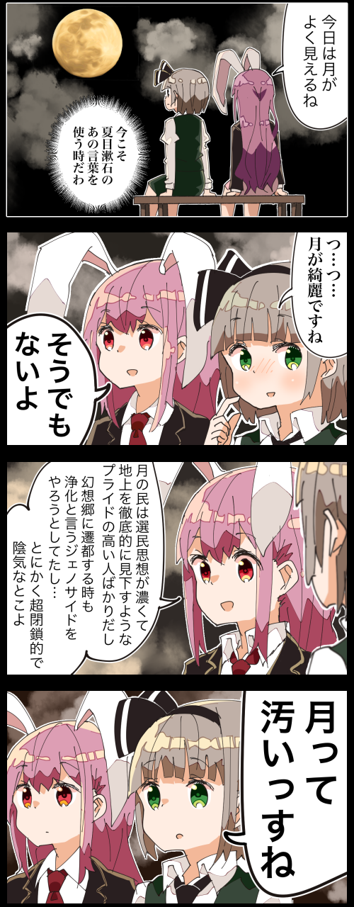 2girls 4koma cloud cloudy_sky comic commentary_request highres jetto_komusou konpaku_youmu moon multiple_girls night reisen_udongein_inaba sky touhou translation_request