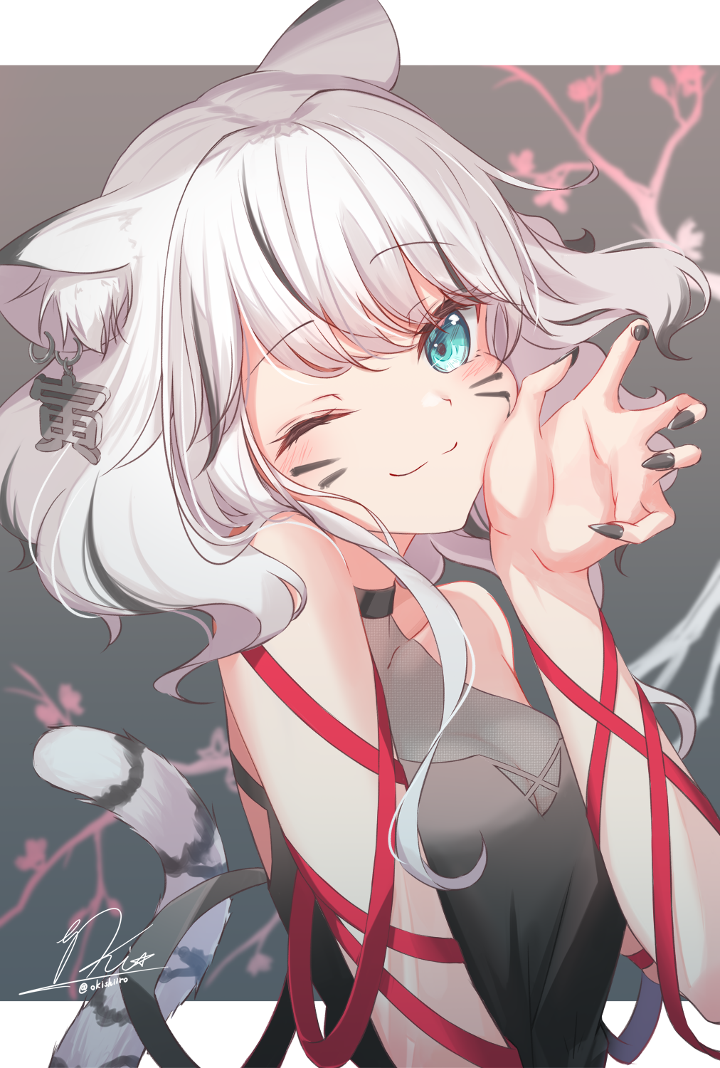 1girl animal_ears black_hair black_nails black_shirt blush breasts chinese_zodiac closed_mouth commentary_request earrings facial_mark fingernails green_eyes hand_up highres jewelry letterboxed long_fingernails looking_at_viewer medium_breasts multicolored_hair nail_polish okishiro one_eye_closed original outside_border red_ribbon ribbon shirt signature sleeveless sleeveless_shirt smile solo streaked_hair tail tiger_ears tiger_girl tiger_tail translation_request twitter_username upper_body whisker_markings white_hair year_of_the_tiger