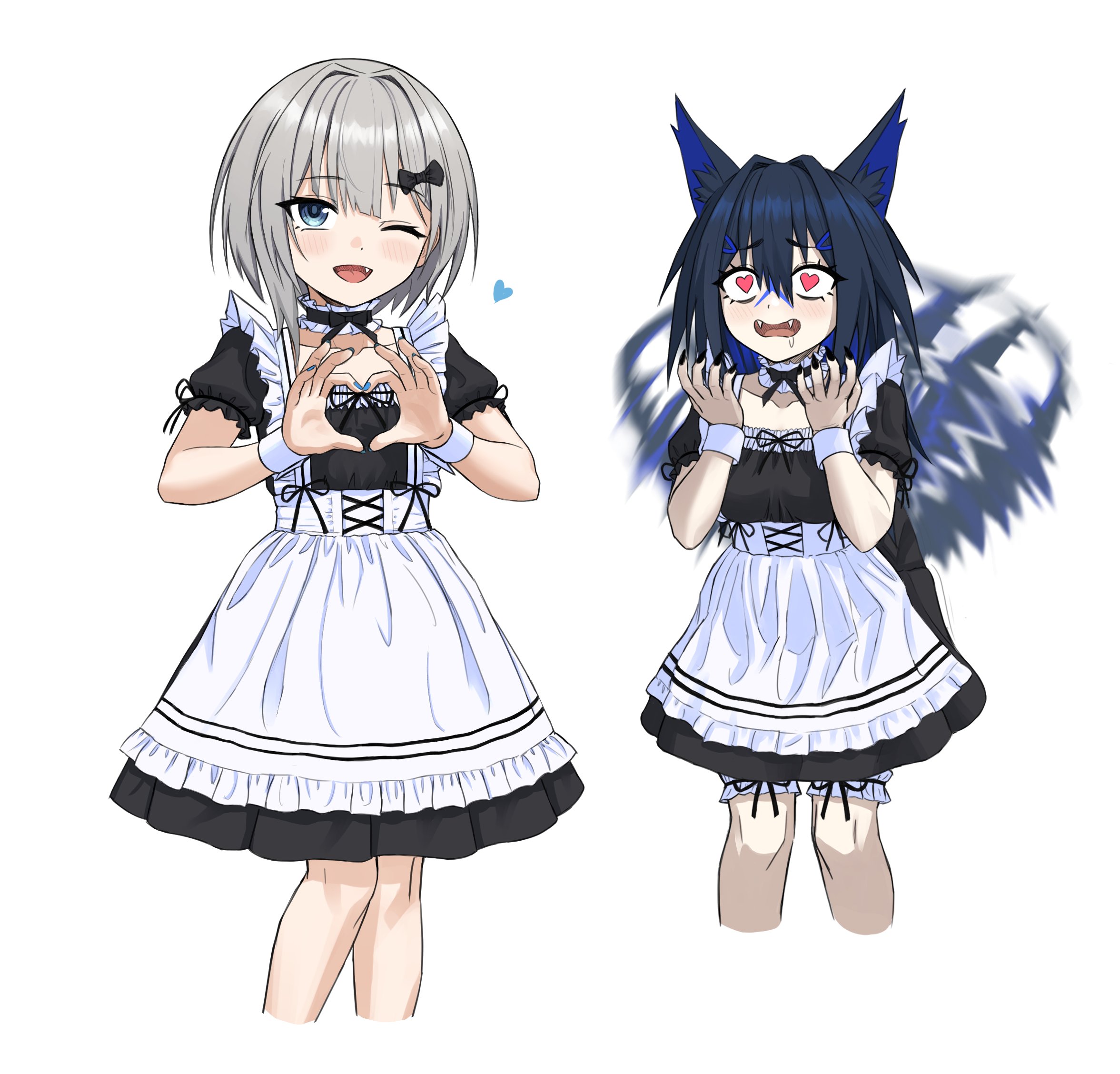2girls :d alternate_costume animal_ear_fluff animal_ears apron black_bow black_choker black_dress black_hair black_nails blue_eyes blue_hair blue_nails blush bow breasts choker collarbone colored_inner_hair commentary cowboy_shot cropped_legs dress drooling enmaided eyes_visible_through_hair fang fang_out fangs fangs_out flat_chest frilled_choker frilled_thigh_strap frills frown grey_hair hair_between_eyes hair_bow hair_intakes hair_ornament hairclip heart heart_hands highres knees_together_feet_apart lomito_(rurine_luna) long_hair lovestruck maid multicolored_hair multiple_girls nail_polish one_eye_closed open_mouth puffy_short_sleeves puffy_sleeves rurine_luna short_hair short_sleeves simple_background small_breasts smile spanish_commentary standing tail tail_wagging thigh_strap two-tone_hair virtual_youtuber wactor_production white_apron white_background wolf_ears wolf_girl wrist_cuffs yof_(sc_gazer)