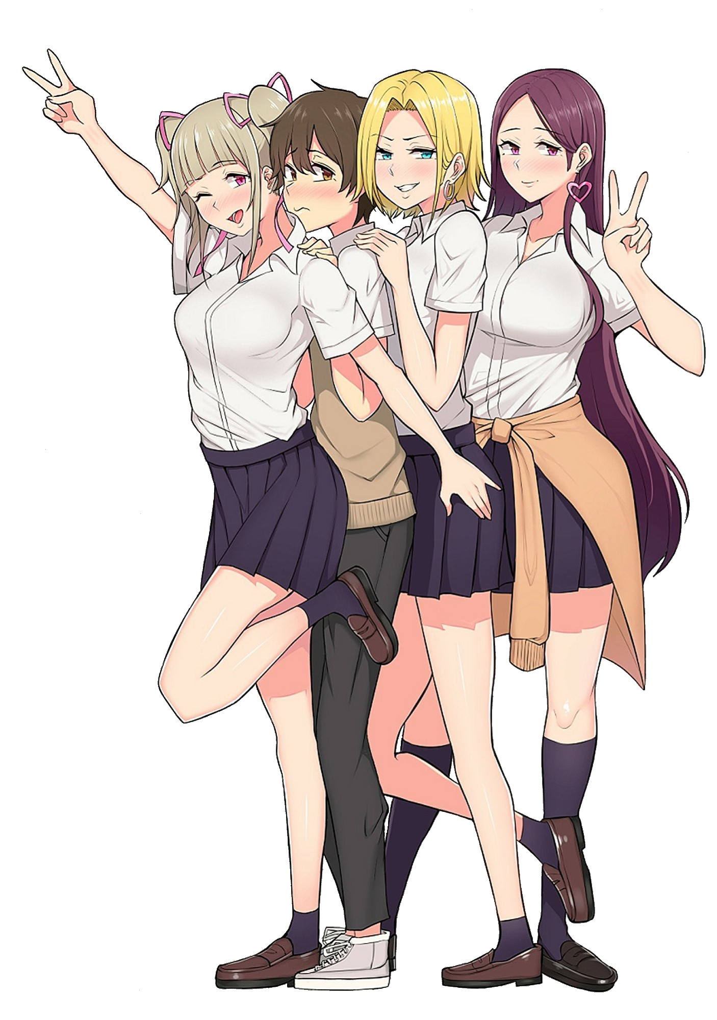 1boy 3girls blonde_hair blue_eyes breasts girl_sandwich hamazaki_reina harem headpat highres imaizumin-chi_wa_douyara_gal_no_tamariba_ni_natteru_rashii imaizumin_keita kurumizaka_ruri large_breasts legs multiple_girls nail_polish naughty_face nori_gorou one_eye_closed purple_eyes purple_hair pussyjob red_eyes sandwiched sasaki_yukina school_uniform skirt smile white_hair wink