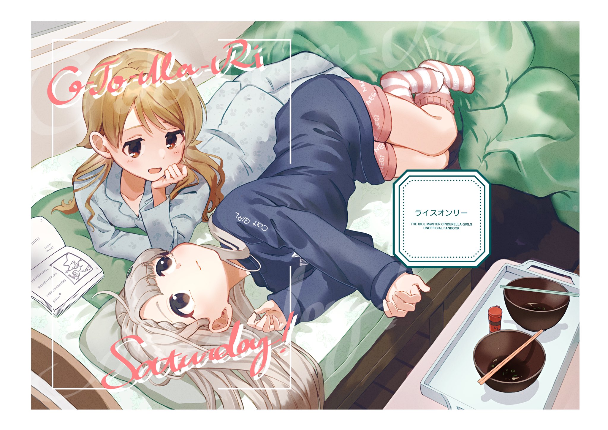 2girls alternate_costume asymmetrical_bangs bed blanket bowl braid braided_bangs cover cover_page eye_contact grey_hair hand_on_own_cheek hand_on_own_face head_rest highres hisakawa_nagi idolmaster idolmaster_cinderella_girls indoors light_brown_hair looking_at_another lying morikubo_nono multiple_girls on_bed on_side on_stomach pajamas print_pajamas raru_buran smile