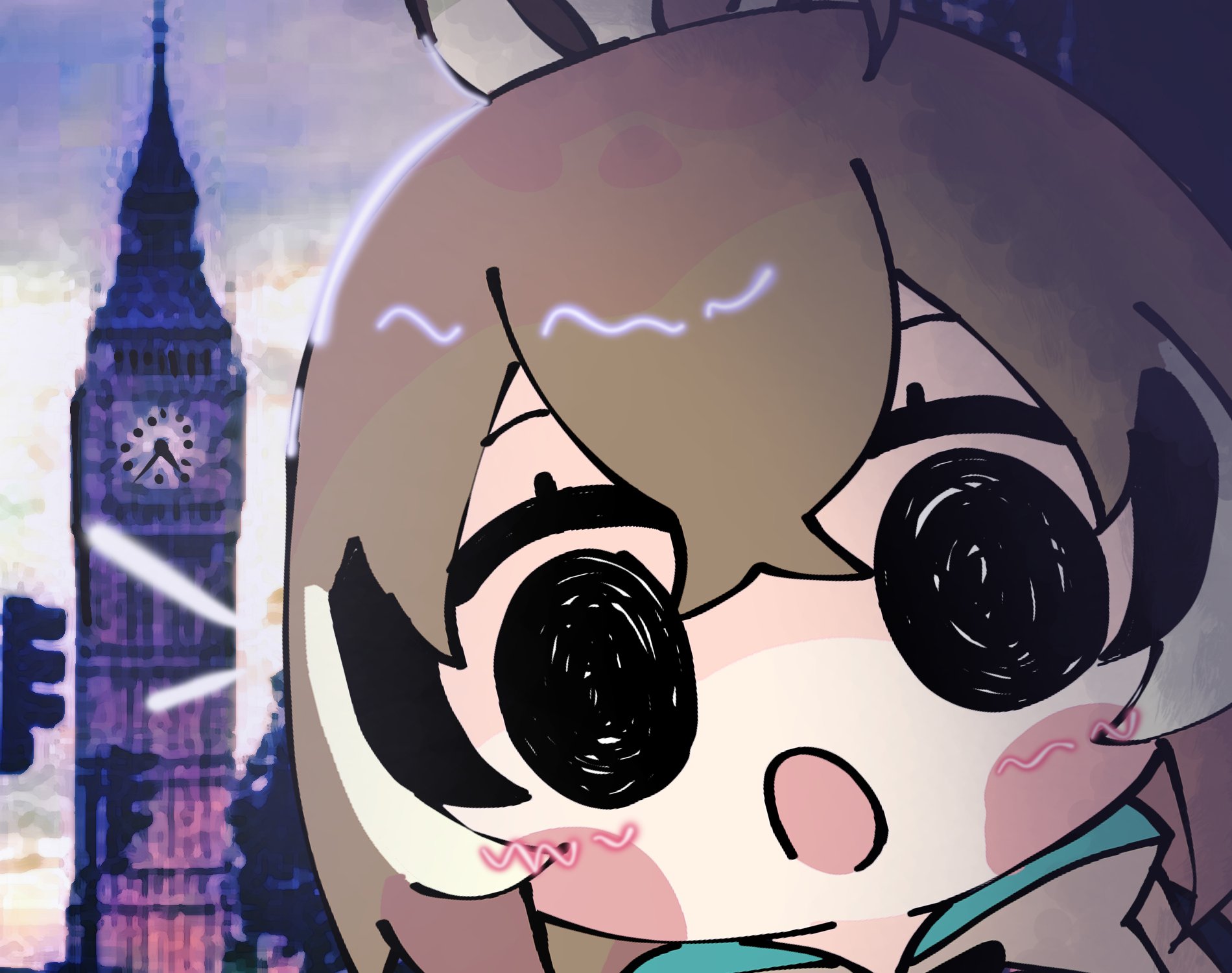 1girl :o ahoge black_eyes brown_capelet brown_cloak brown_hair capelet cloak clock clock_tower feather_hair_ornament feathers hair_ornament highres hololive hololive_english koyoinacho long_hair looking_at_viewer multicolored_hair nanashi_mumei nanashi_mumei_(1st_costume) notice_lines open_mouth photo_background ponytail purikura ribbon smol_mumei streaked_hair tower very_long_hair virtual_youtuber
