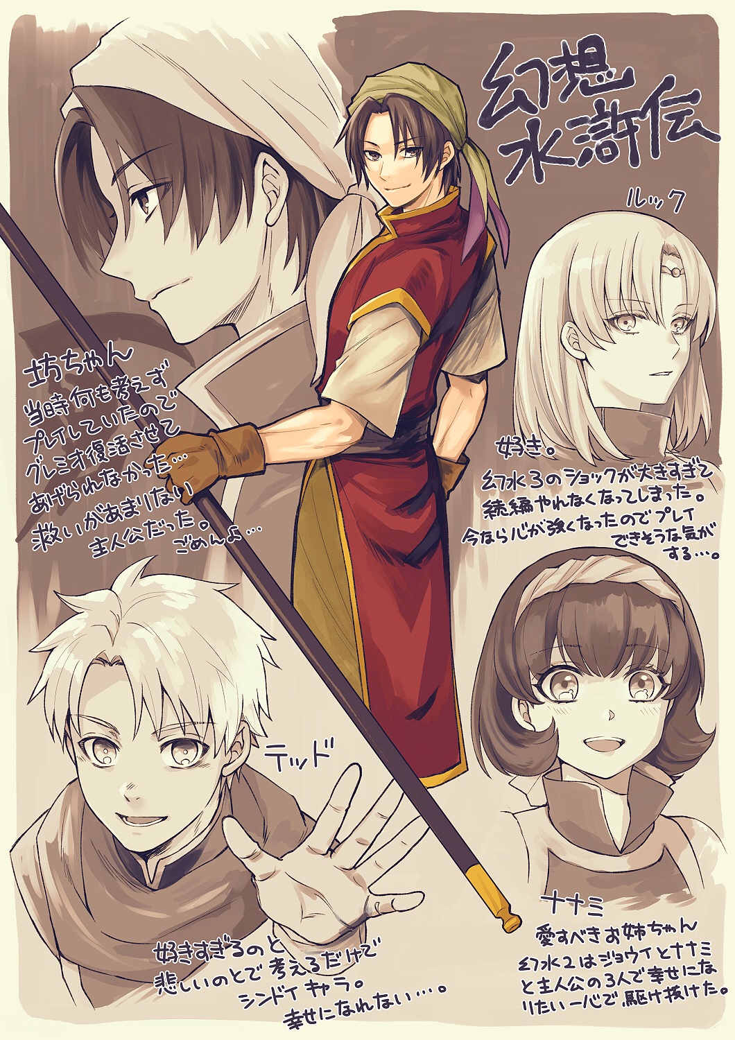 1girl 3boys gensou_suikoden gensou_suikoden_ii highres hizuki_aya looking_at_viewer luc_(suikoden) monochrome multiple_boys nanami_(suikoden) open_mouth simple_background smile ted_(suikoden) tir_mcdohl