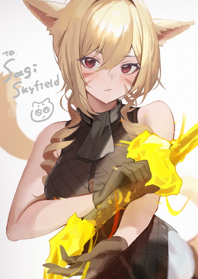 1girl animal_ears ascot bad_link bad_skeb_link black_ascot black_gloves black_shirt blonde_hair breasts cat_ears cat_girl cat_tail commission cyobiro drill_hair drill_sidelocks facial_mark final_fantasy final_fantasy_xiv gloves hair_between_eyes holding holding_weapon large_breasts looking_at_viewer medium_hair miqo'te red_eyes shirt sidelocks signature skeb_commission solo tail warrior_of_light_(ff14) weapon whisker_markings white_background