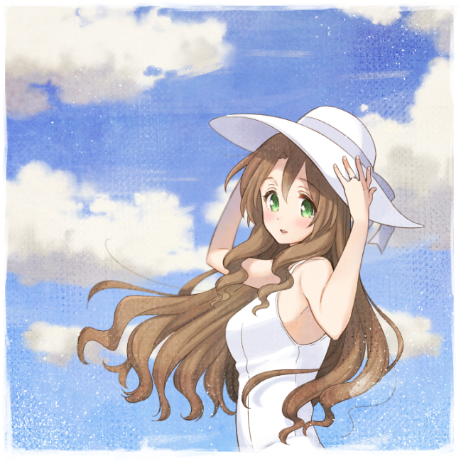 1girl aerith_gainsborough alternate_costume bare_arms bare_shoulders blue_sky blush breasts brown_hair cloud cloudy_sky dress final_fantasy final_fantasy_vii green_eyes hat holding holding_unworn_clothes holding_unworn_hat jewelry krudears long_hair looking_at_viewer medium_breasts outdoors parted_bangs parted_lips ring sidelocks sky sleeveless sleeveless_dress smile solo sun_hat sundress unworn_hat unworn_headwear upper_body wavy_hair white_dress white_hat