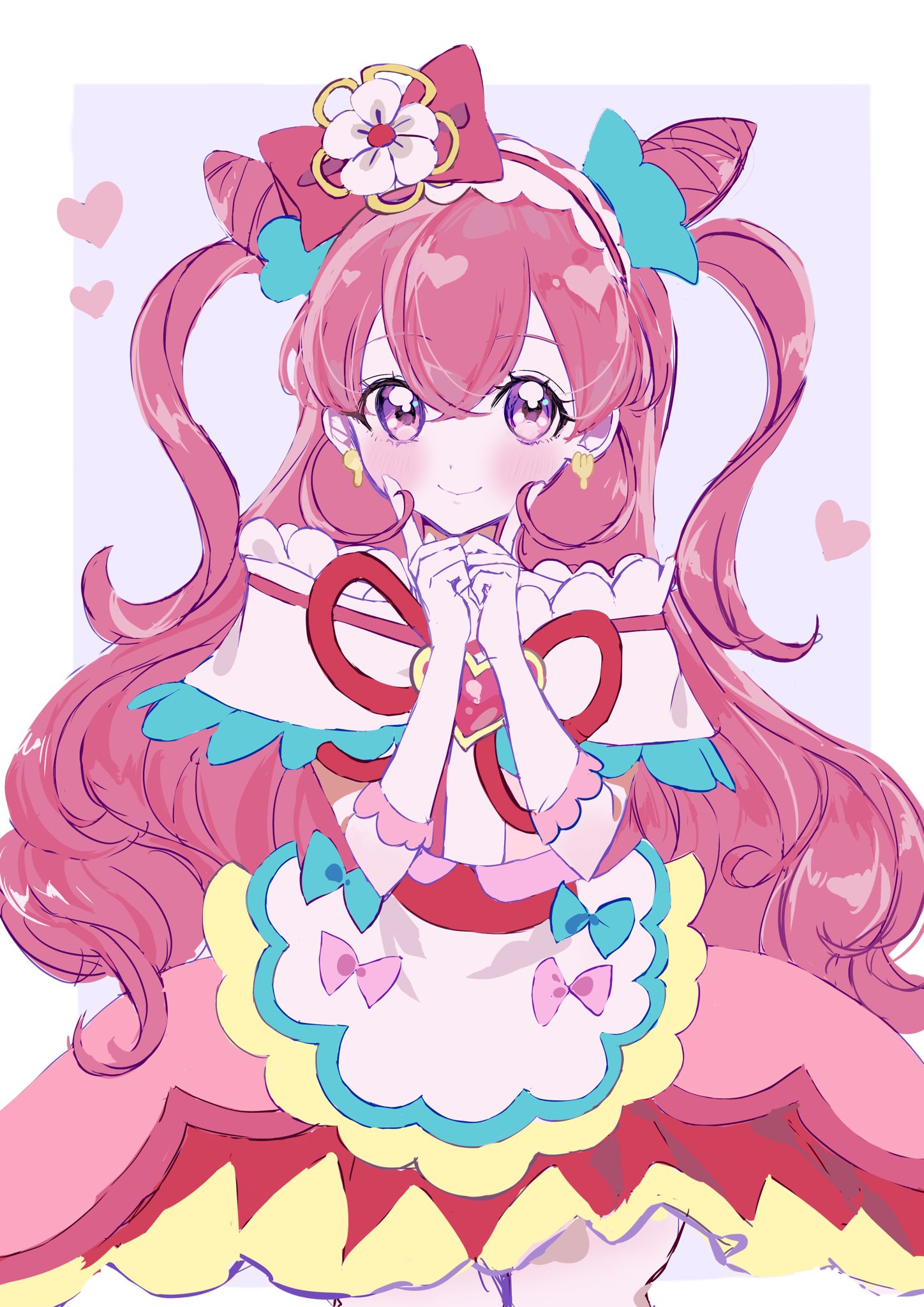 1girl apron bow commentary_request cone_hair_bun cure_precious delicious_party_precure earrings gloves hair_bow hair_bun highres jewelry long_hair magical_girl nagomi_yui pink_hair precure purple_eyes seika_(yuimarutoka0219) smile solo two_side_up white_gloves