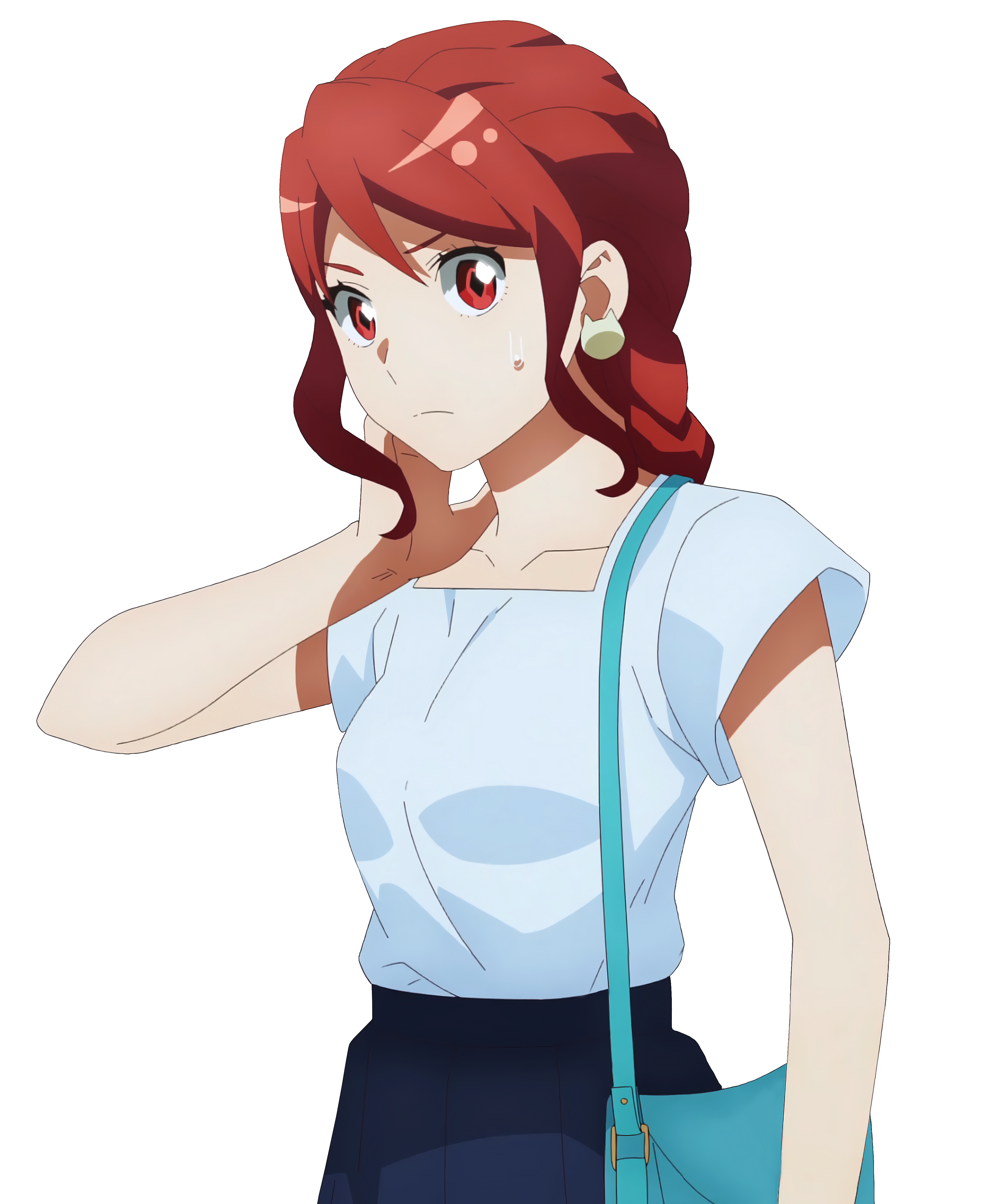 1girl absurdres anime_screenshot bag cat_earrings earrings highres hoshino_anzu jewelry red_eyes red_hair romantic_killer shirt shoulder_bag stitched third-party_edit transparent_background white_shirt