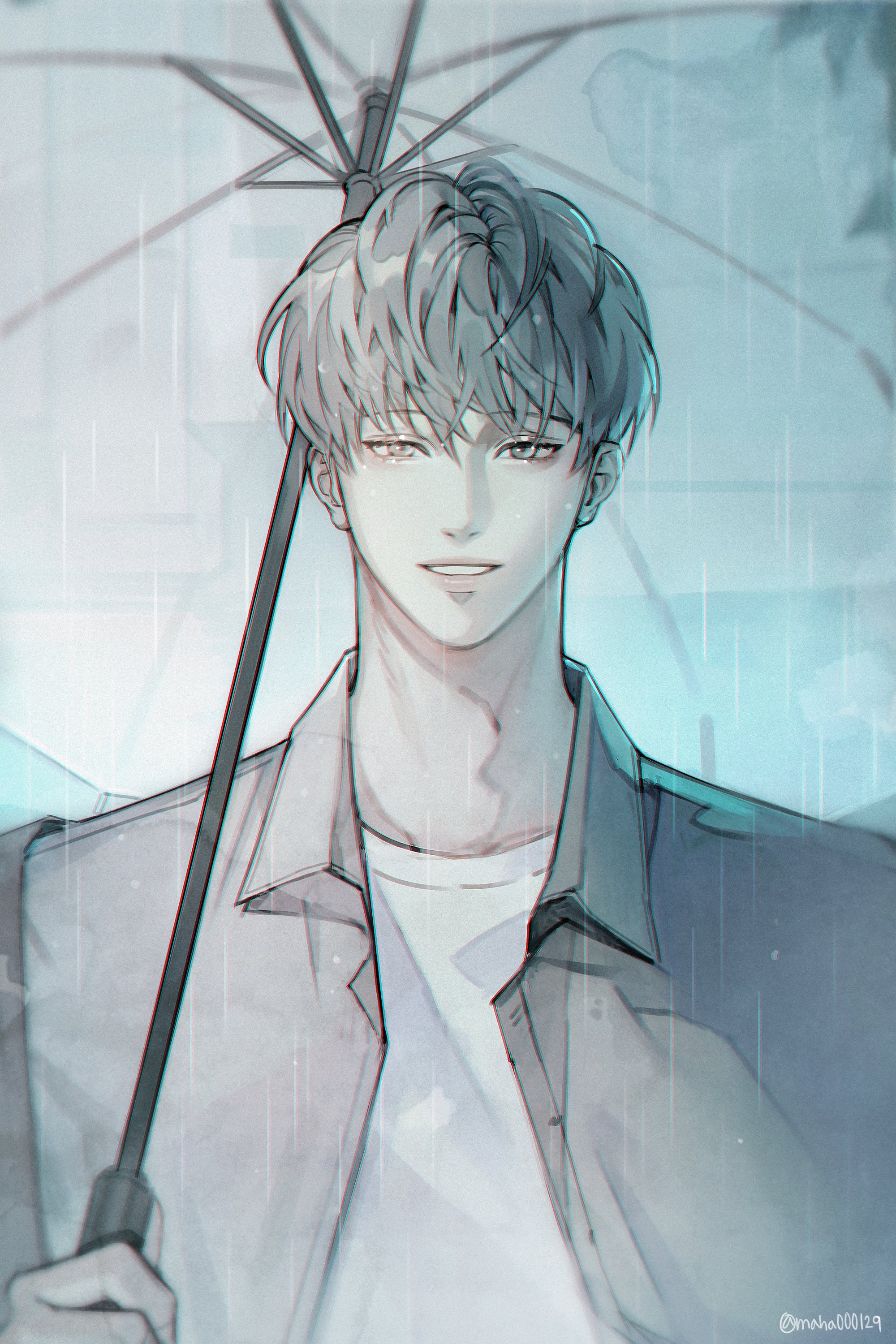 1boy absurdres doh_woo-won grey_eyes grey_hair grey_shirt highres holding holding_umbrella korean_commentary looking_at_viewer maha000129 open_mouth rain shirt smile solo the_pizza_delivery_man_and_the_gold_palace transparent transparent_umbrella twitter_username umbrella white_shirt