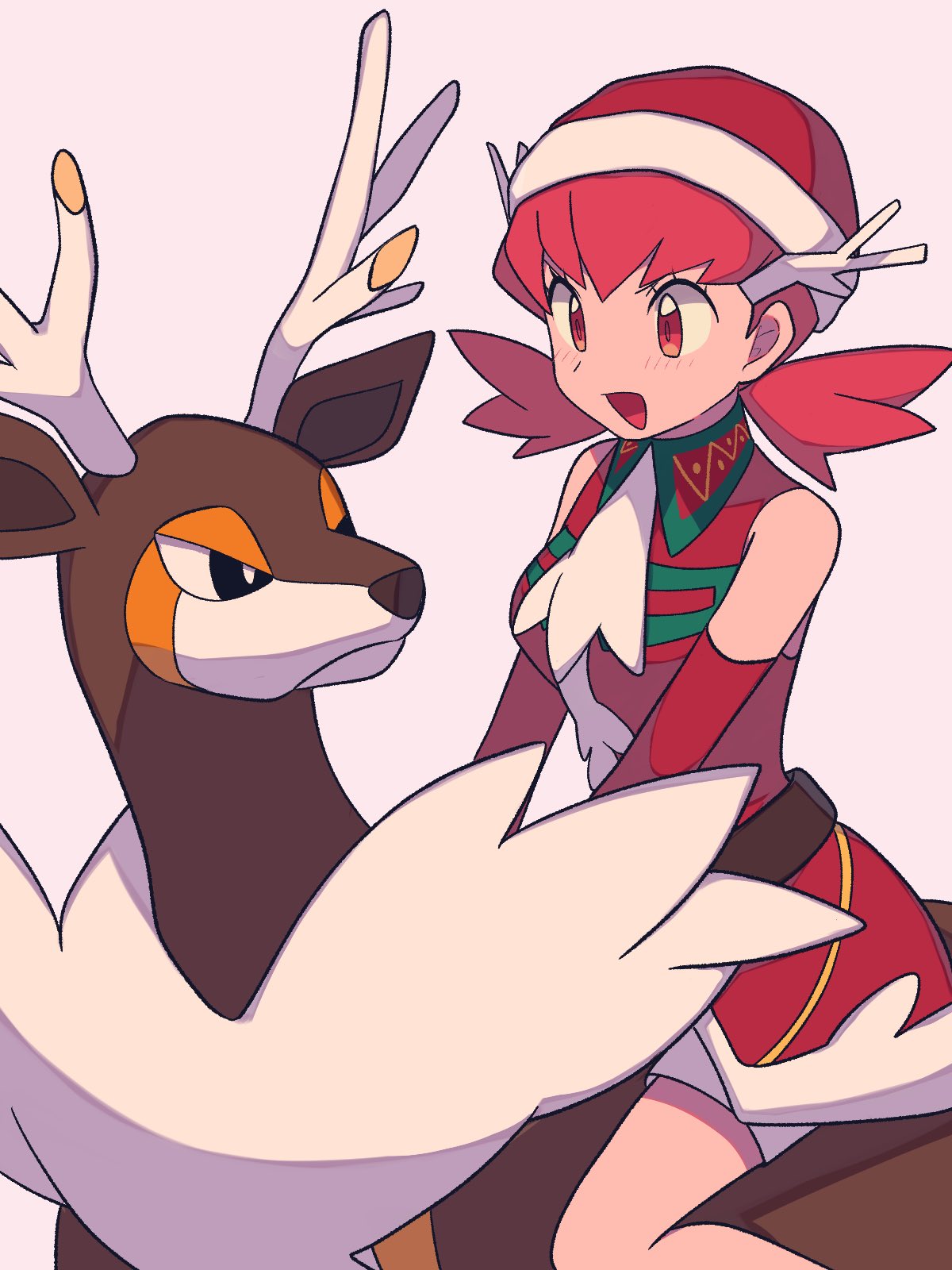christmas gen_5_pokemon hat highres nintendo pink_hair pokemon pokemon_(creature) pokemon_masters_ex santa_hat sawsbuck sawsbuck_(winter) short_hair sleeveless tyako_089 whitney_(holiday_2022)_(pokemon) whitney_(pokemon)