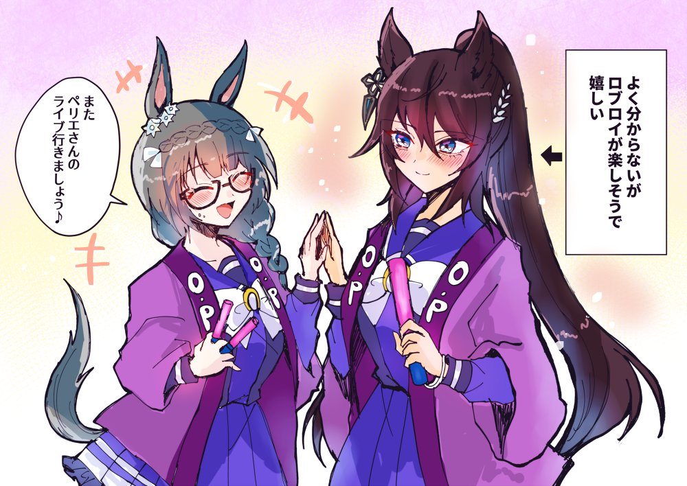 2girls ^_^ animal_ears black-framed_eyewear black_hair blush bow bowtie braid closed_eyes crown_braid dark-skinned_female dark_skin glasses happi horse_ears horse_girl horseshoe_ornament japanese_clothes long_hair long_sleeves looking_at_another mimoe multiple_girls open_mouth pleated_skirt ponytail purple_happi purple_serafuku purple_shirt purple_skirt sailor_collar sailor_shirt school_uniform serafuku shirt skirt smile symboli_kris_s_(umamusume) tracen_school_uniform umamusume white_bow white_bowtie zenno_rob_roy_(umamusume)