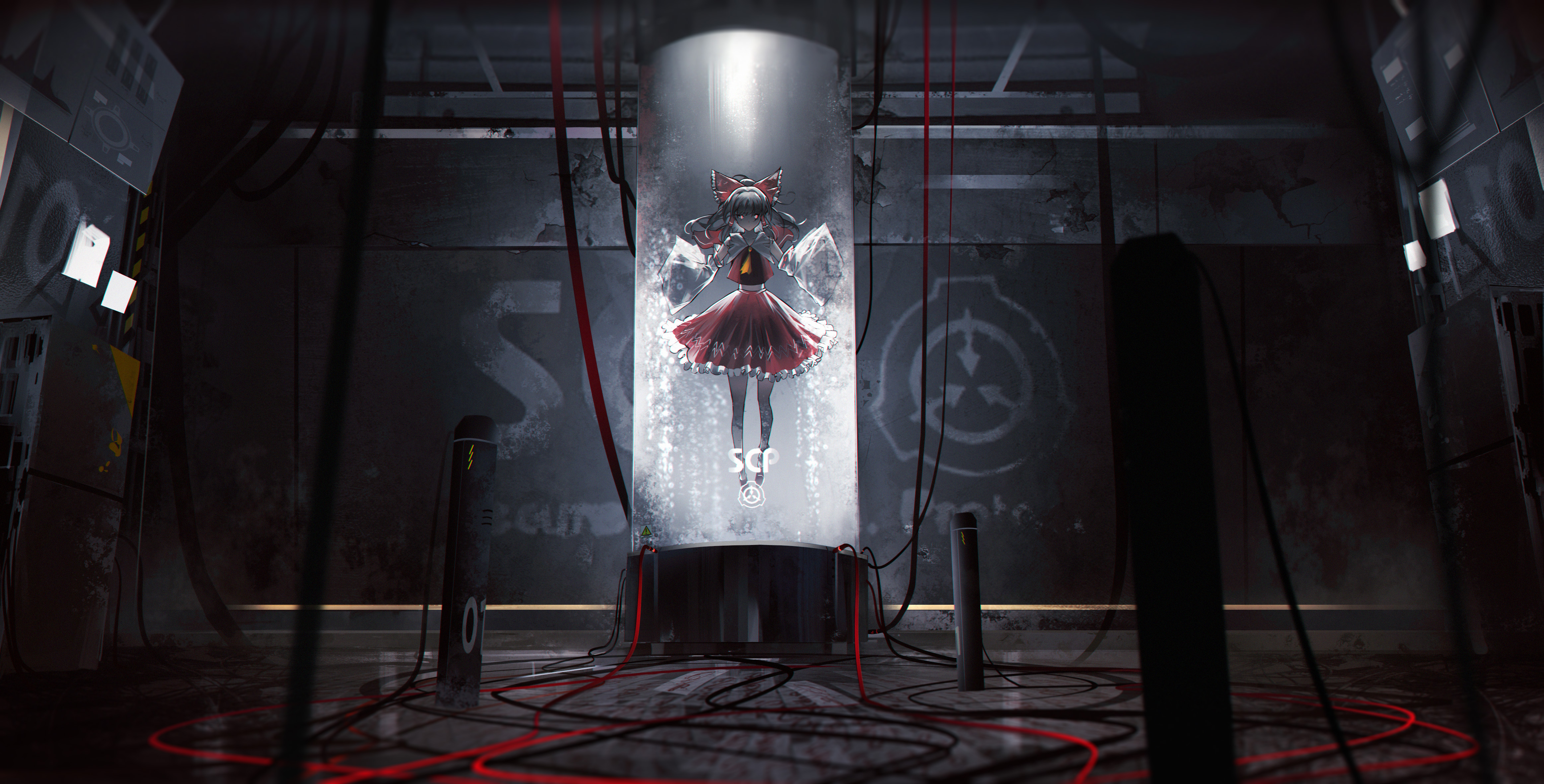 1girl absurdres ascot bow brown_hair cable detached_sleeves encasement gensokyo_delimitation geralt7 glowing glowing_eyes hair_bow hair_tubes hakurei_reimu highres in_container indoors liquid looking_at_viewer machinery red_bow red_eyes red_shirt red_skirt scp_foundation shirt sidelocks skirt solo stasis_tank submerged touhou tube underwater white_sleeves wide_sleeves yellow_ascot