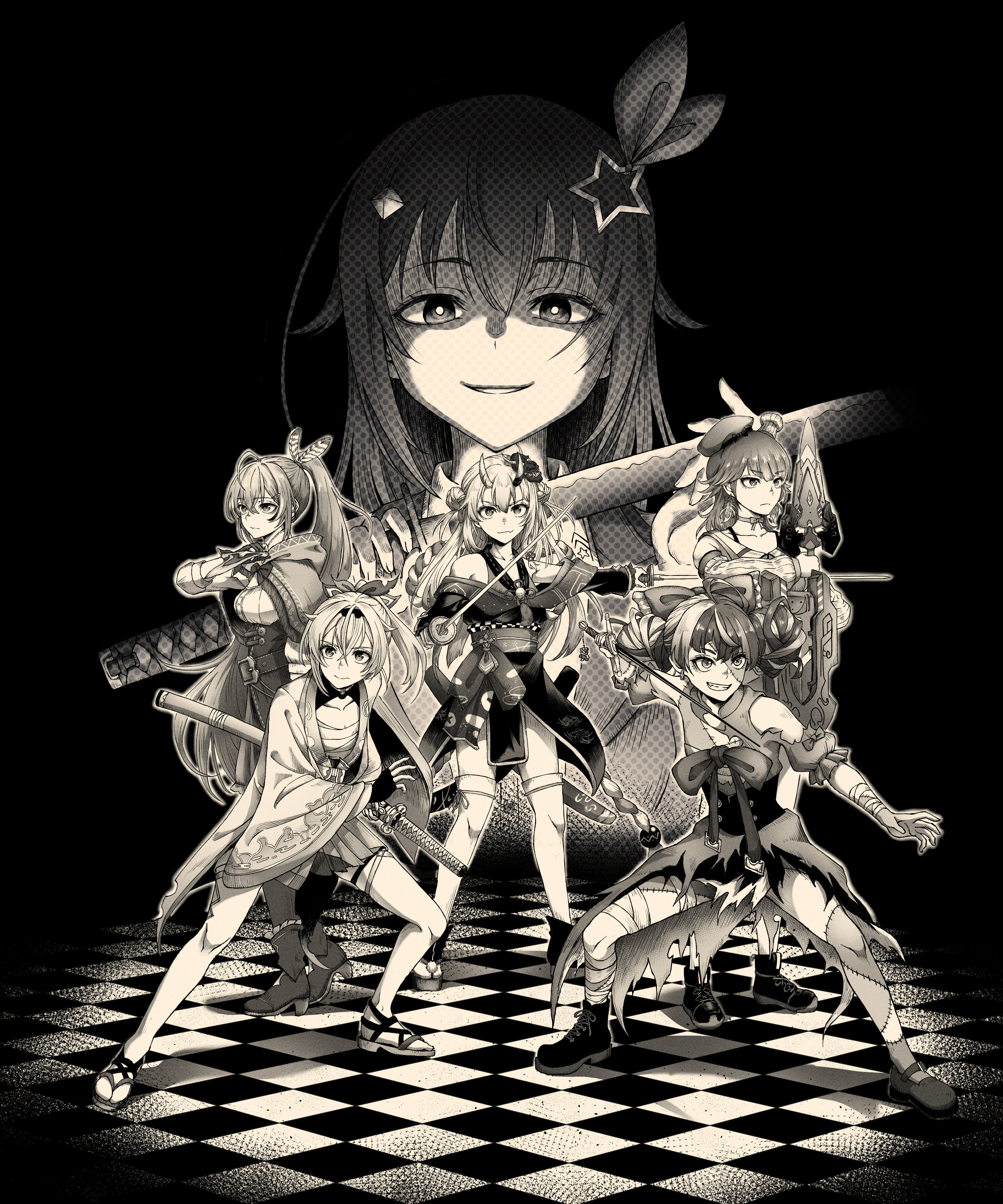 6+girls absurdres ahoge ankle_boots bell belt blunt_ends boots bow bow_choker brown_capelet brown_cloak brown_corset cape capelet choker cloak colored_skin corset diamond_hair_ornament double_bun earrings evil_grin evil_smile fangs feather_earrings feather_hair_ornament feathers fingerless_gloves frilled_sleeves frills gloves grey_hair grey_skin greyscale grin hair_bell hair_bun hair_ornament hair_ribbon hairclip hajime_wataru haori highres hololive hololive_english hololive_indonesia horns japanese_clothes jewelry jingle_bell katana kazama_iroha kimono kouhaku_nawa kureiji_ollie long_hair long_sleeves mask mask_on_head monochrome multicolored_hair multicolored_skin multiple_girls nakiri_ayame nanashi_mumei nanashi_mumei_(1st_costume) off_shoulder okobo oni oni_mask partially_fingerless_gloves patchwork_skin platform_sandals pleated_skirt ponytail ribbon rope samurai sandals shimenawa short_kimono skin-covered_horns skirt smile star_(symbol) star_hair_ornament stitched_arm stitched_face stitched_leg stitched_torso stitches streaked_hair sword tabi takanashi_kiara tassel tassel_hair_ornament thighhighs tokino_sora tokino_sora_(1st_costume) two-tone_skin two_side_up very_long_hair virtual_youtuber wavy_hair weapon white_hair white_skin white_thighhighs wide_sleeves zombie