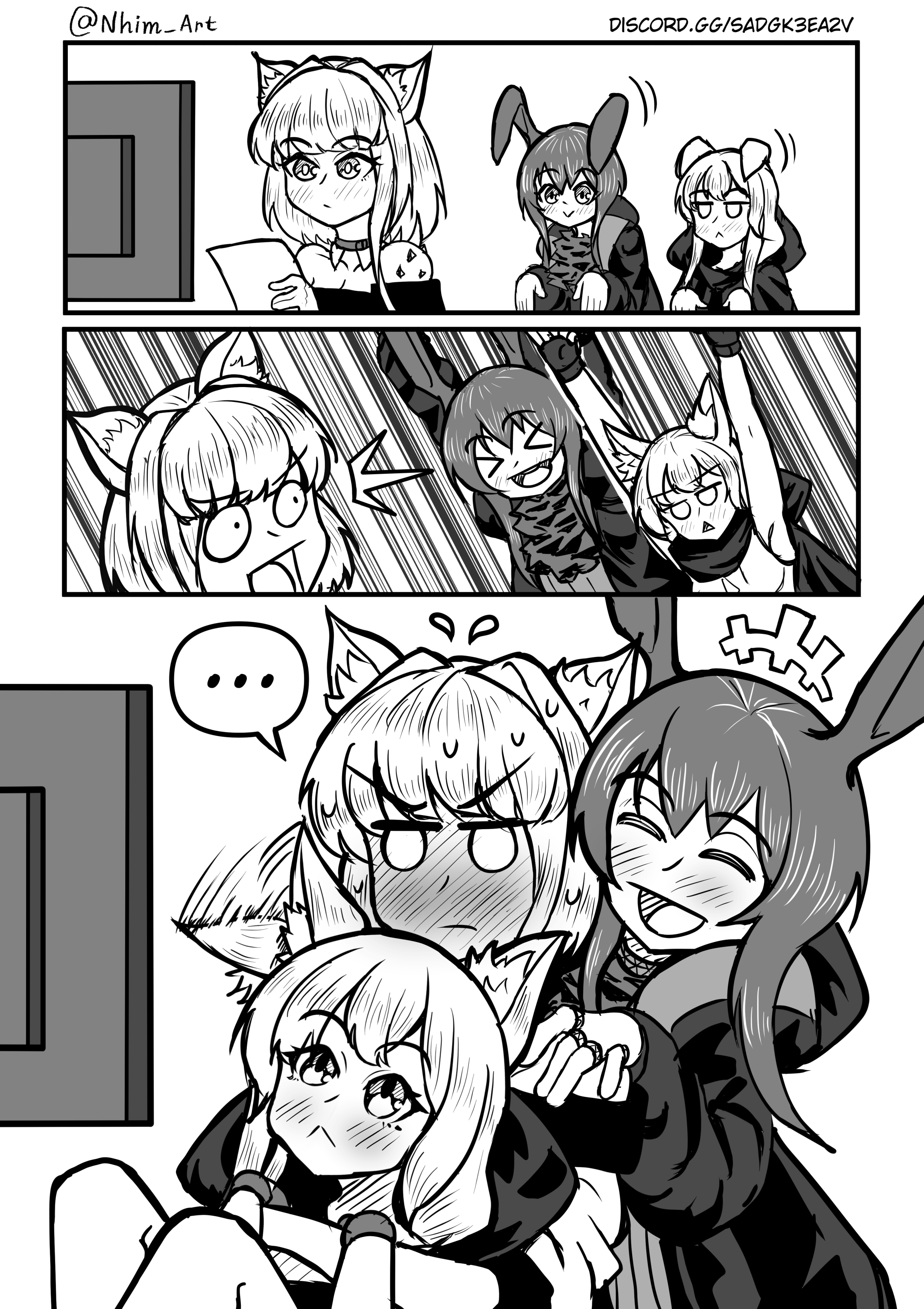1girl absurdres amiya_(arknights) arknights highres hug kal'tsit_(arknights) monitor monochrome nhim rosmontis_(arknights) solo white_background