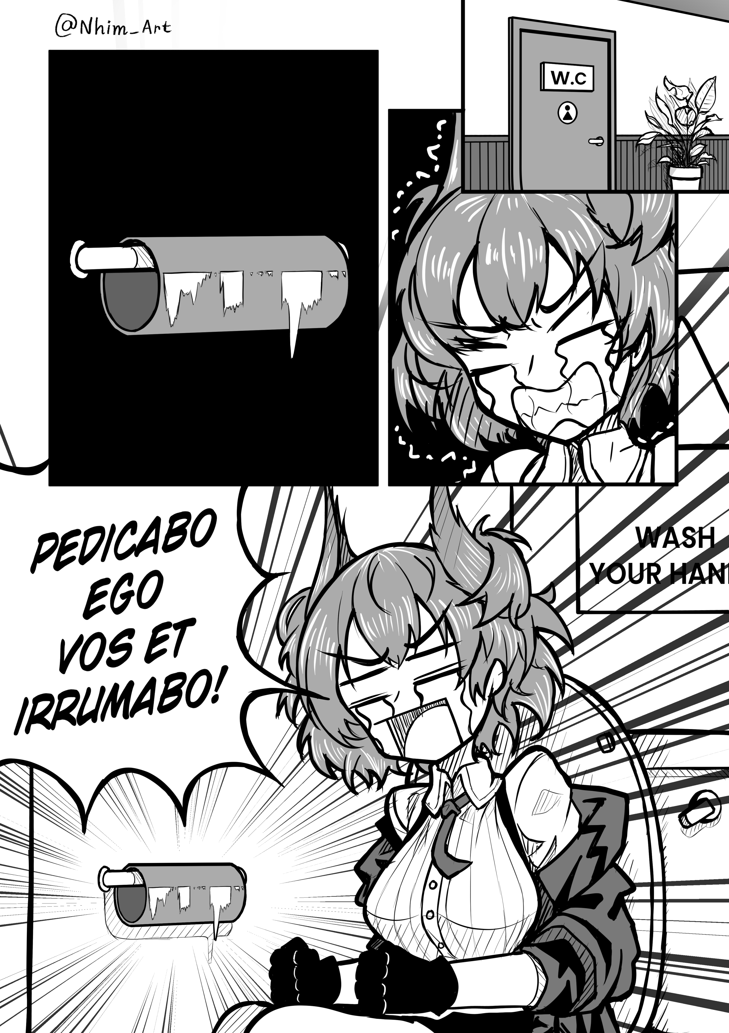 1girl absurdres arknights comic english_text fiammetta_(arknights) greyscale highres monochrome nhim restroom_symbol sitting solo toilet toilet_paper