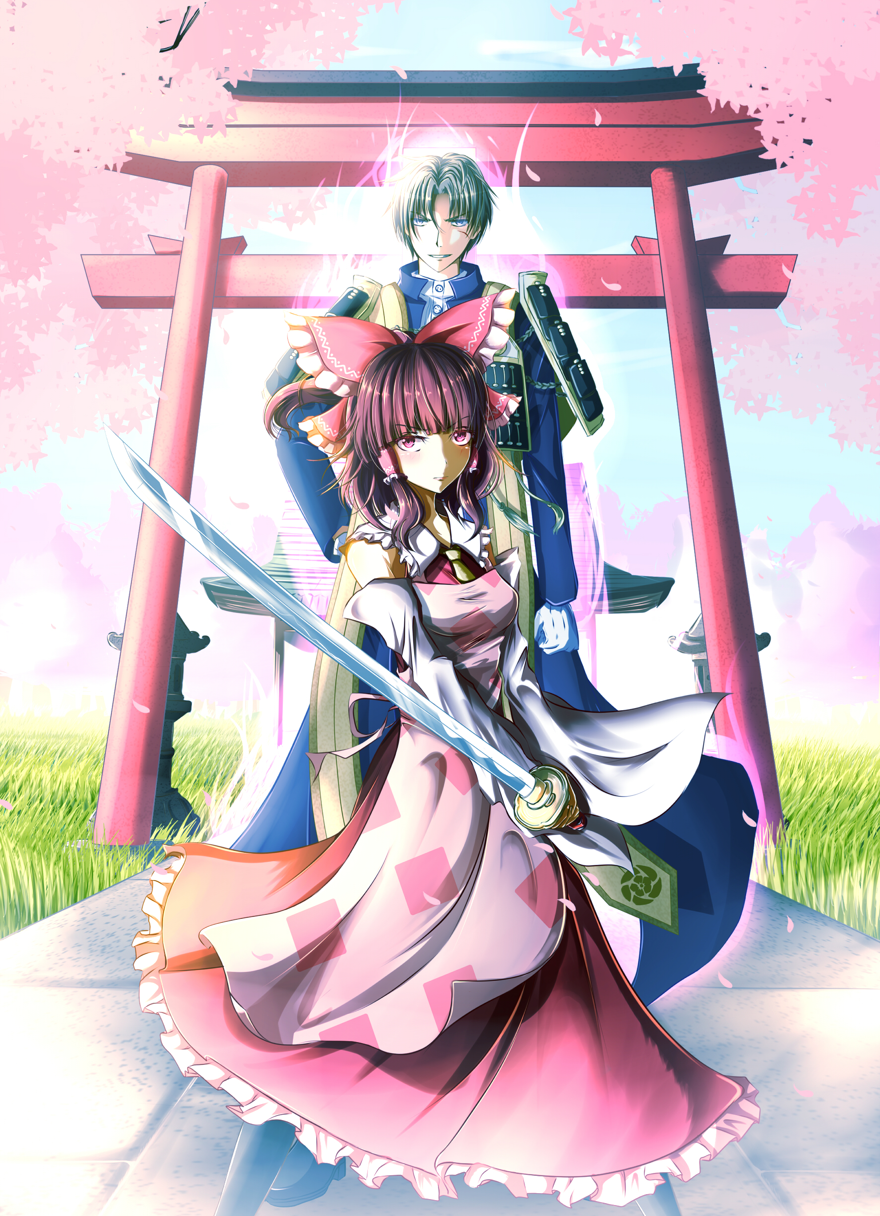 1boy 1girl absurdres apron armor aura blue_kimono blunt_bangs blush bow brown_hair cherry_blossoms closed_mouth commentary_request cookie_(touhou) dress frilled_bow frilled_hair_tubes frills full_body gloves grass grey_hair grin hair_bow hair_tubes hakurei_reimu heshikiri_hasebe highres holding holding_sword holding_weapon japanese_armor japanese_clothes katana kimono long_hair necktie parted_bangs pink_apron pink_bow pink_dress rurima_(cookie) sakuna_brownie short_hair shoulder_armor sidelocks smile sode sword torii touhou touken_ranbu tree weapon white_gloves yellow_necktie