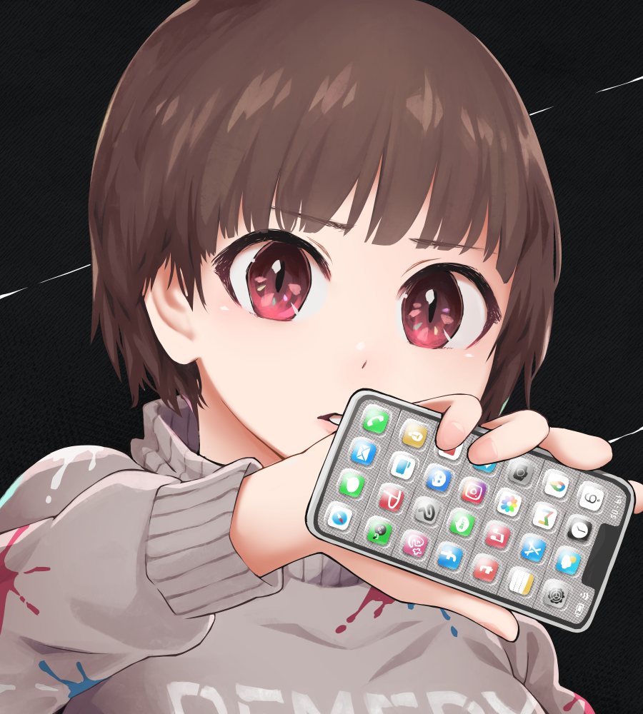 1girl black_background brown_hair cellphone grey_sweater holding holding_phone looking_at_viewer original parted_lips phone portrait red_eyes short_hair smartphone solo sweater yajirushi_(chanoma)
