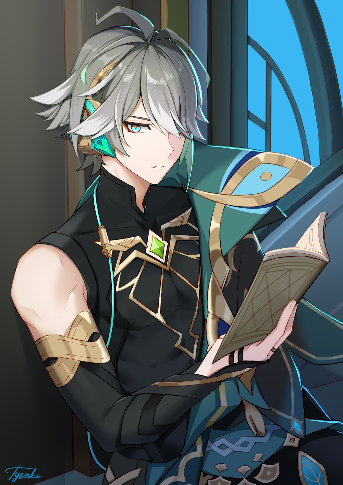 1boy ahoge alhaitham_(genshin_impact) artist_name black_gloves black_shirt book cape commentary_request compression_shirt elbow_gloves fingerless_gloves gem genshin_impact gloves gold_trim green_cape green_eyes grey_hair hair_over_one_eye hand_up highres holding holding_book indoors looking_at_viewer male_focus open_book parted_bangs parted_lips shirt short_hair sidelocks signature sleeveless sleeveless_shirt solo swept_bangs tyenka7728 upper_body window