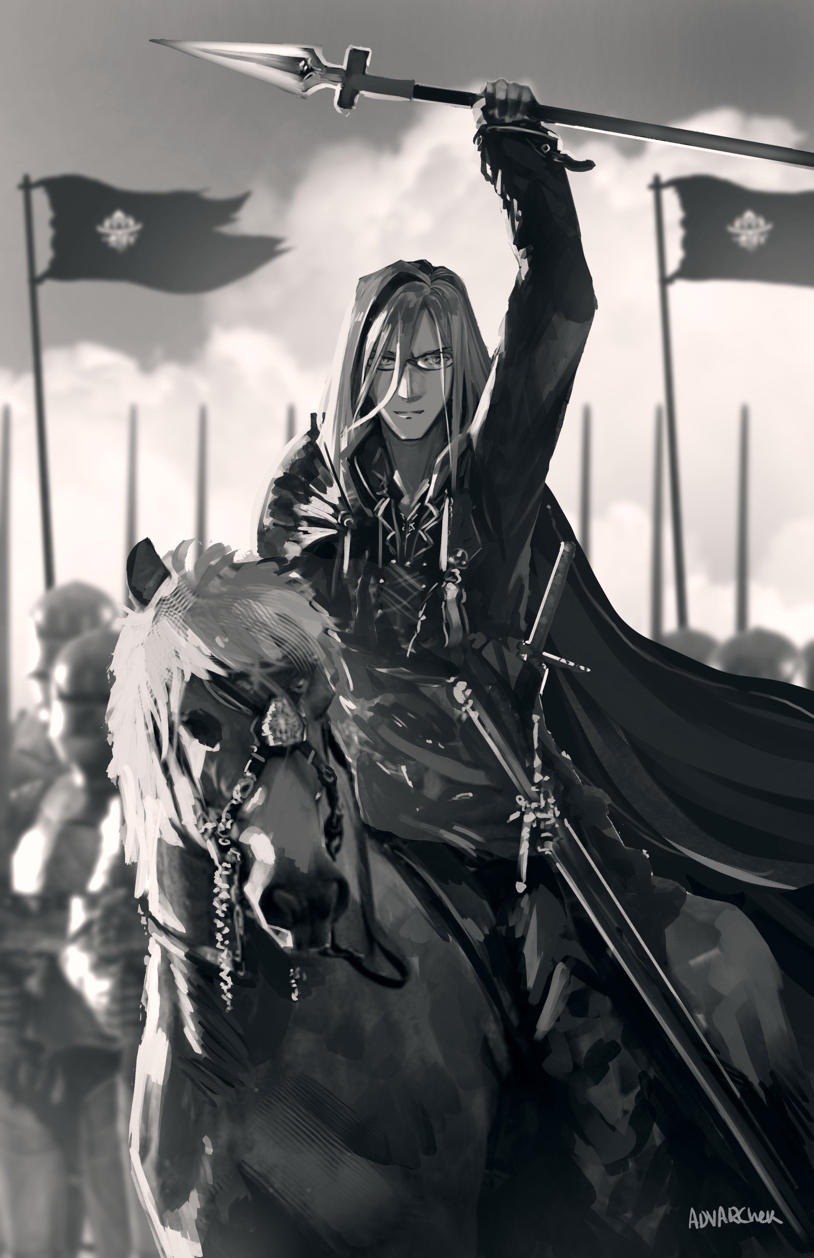 1boy absurdres advarcher arm_up armor cape cloud commentary english_commentary flag full_body glasses gloves greyscale hair_between_eyes highres holding holding_polearm holding_weapon holostars holostars_english horseback_riding jacket long_hair looking_at_viewer male_focus monochrome multicolored_hair multiple_swords noir_vesper noir_vesper_(old_design) parted_lips polearm riding sheath sheathed shoulder_armor soldier solo_focus spear streaked_hair sword virtual_youtuber weapon