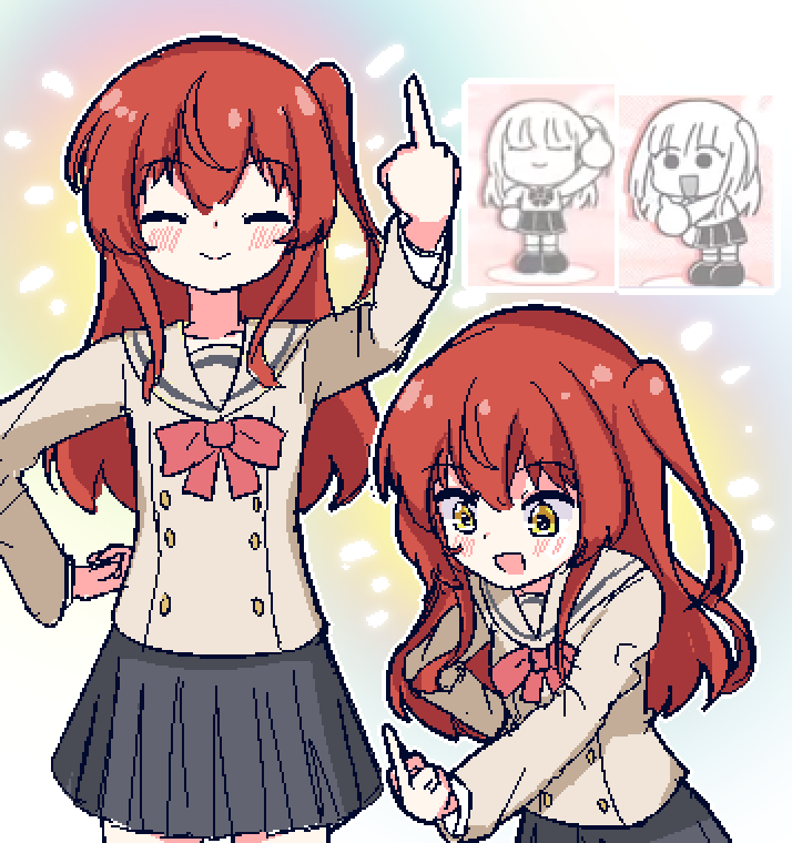 bocchi_the_rock! bow brown_jacket buttons chibikki clenched_hand double-breasted green_eyes hair_between_eyes hand_on_own_hip hand_up jacket kita_ikuyo long_hair middle_finger oekaki one_side_up pleated_skirt red_bow red_hair school_uniform side_ponytail skirt smile