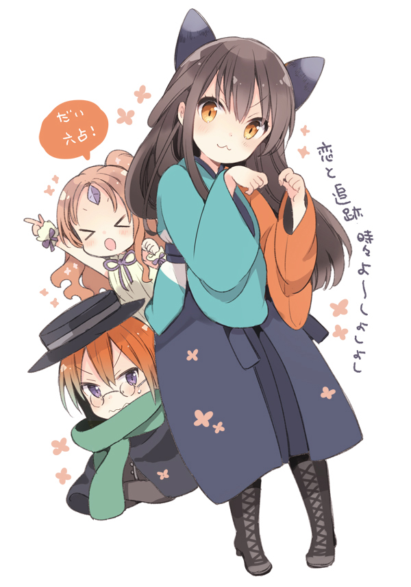 >_< 3girls :3 :o arm_up black_bow black_footwear black_headwear blue_kimono blush boots bow brown_hair cape clenched_hand closed_eyes closed_mouth collared_shirt forehead_jewel frilled_cuffs gem glasses green_scarf hair_between_eyes hair_bow hand_up harikamo hat index_finger_raised iroi_saku japanese_clothes kimono lace-up_boots light_brown_hair long_hair looking_at_viewer multiple_girls neck_ribbon open_mouth orange_eyes orange_hair parted_bangs paw_pose purple_eyes purple_gem purple_ribbon red_kimono ribbon scarf shirt short_hair single_sidelock sleeveless sleeveless_shirt speech_bubble sweat tatsumi_kon two-tone_kimono urara_meirochou v-shaped_eyebrows wavy_hair wavy_mouth white_shirt yureeru_(urara_meirochou)